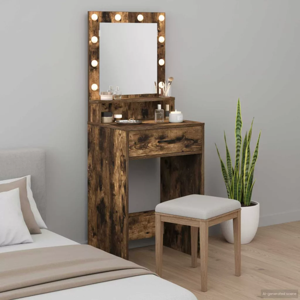 - Integrált világítás: Az asztal LED világítással van felszerelve, így minden sminkelés során tökéletes fényt biztosít. A praktikus nyomógomb egyszerűsíti a használatot, hogy még kényelmesebb legyen az öltözködés.