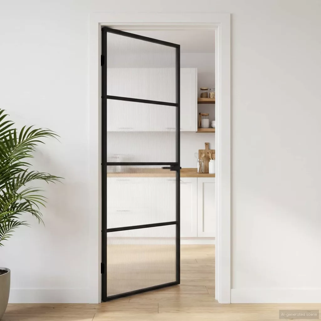 - Anyagok: Magas minőségű hőkezelt üvegből és alumíniumból készült, ez a belsőajtó erőt és stílust sugall. Az üveg törésálló, biztonságot és eleganciát nyújt. Az alumínium könnyű, mégis masszív keretet ad, így az ajtó tartós és légies.