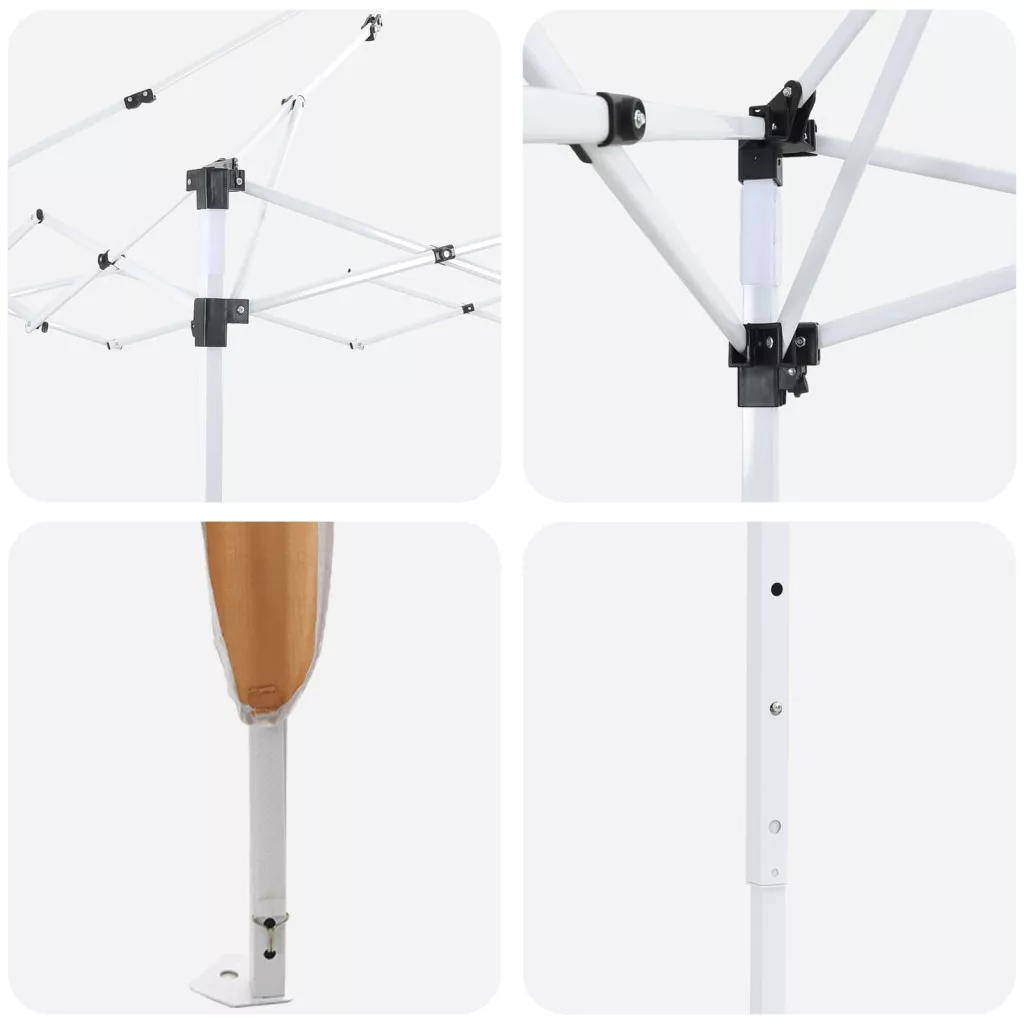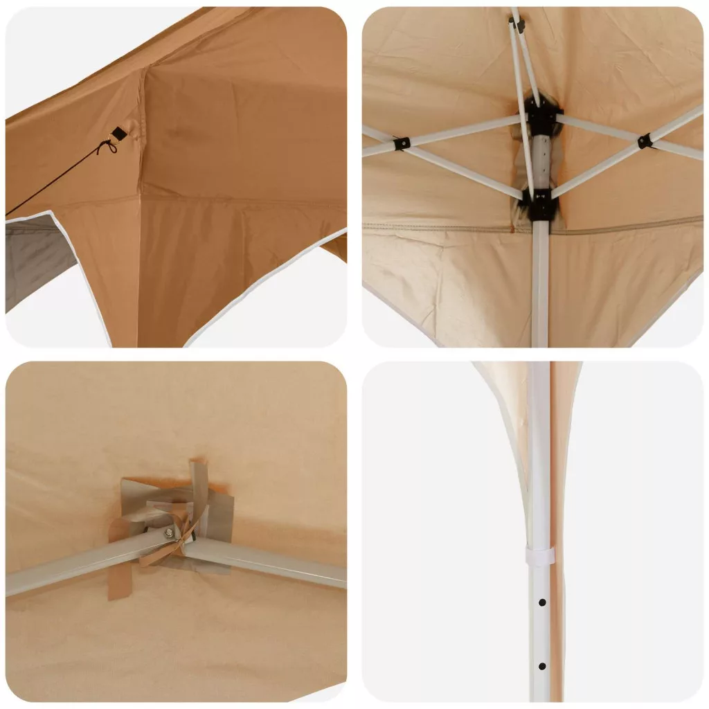 - Jellemzők / Funkció / Dizájn: A sátor manuális magasságállító mechanizmussal van ellátva, amivel három szint között választhatod meg a magasságot. Rugalmas dizájnja lehetővé teszi, hogy igazodj a különböző eseményekhez, miközben stabilan megáll.