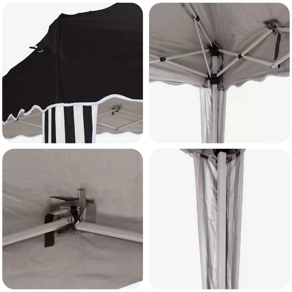 - Funkciók /Tervezés: A sátor kézi magasságállító mechanizmussal van felszerelve, ami három szinten állítható. Ez rugalmasságot ad a különböző eseményekhez, így a vendégek kényelmesen mozoghatnak alatta. Modern designja miatt tökéletes bármilyen helyszínhez.