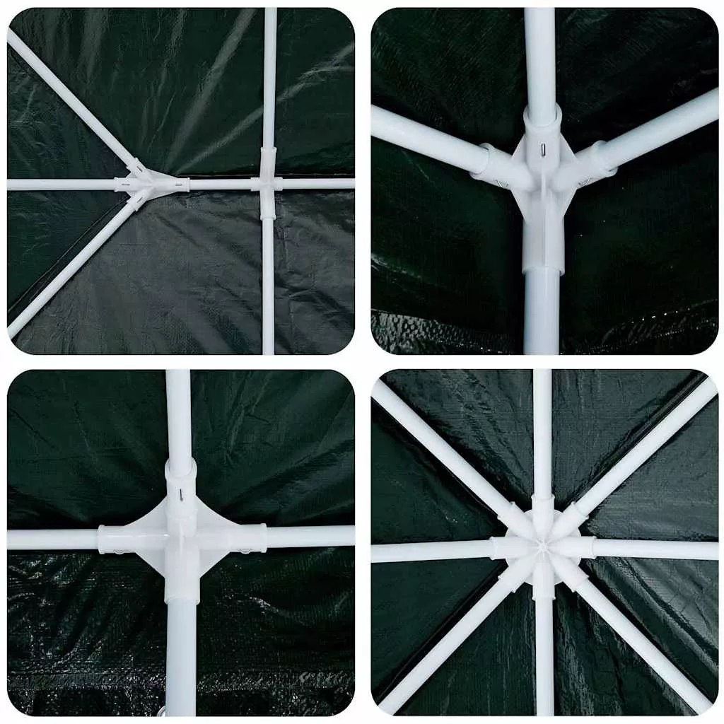 - Anyagok: A sátor tartós polietilénből készült, ami nemcsak jól néz ki, hanem megnöveli a tartósságát is. Erős UV-sugárzásnak és víznek is ellenáll, így különböző időjárási körülmények között is jól teljesít.