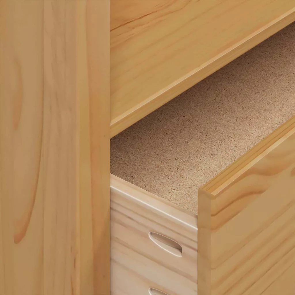- Prémium Tömör Fenyőfa: Ez a ruhásszekrény gondosan válogatott tömör fenyőfából készült, aminek tartóssága és ellenállósága páratlan. Ez az anyagválasztás nemcsak hosszú élettartamot biztosít, hanem feldobja a szekrény külsejét is. Természetes megjelenése eleganciát és melegséget kölcsönöz bármely hálószobának, megerősítve ezzel a stílust és tartósságot.