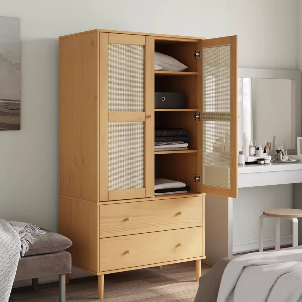 Ez a klasszikus stílusú faszekrény bőséges tárolóhelyet biztosít ruhái, cipői és kiegészítői rendezett tárolásához.