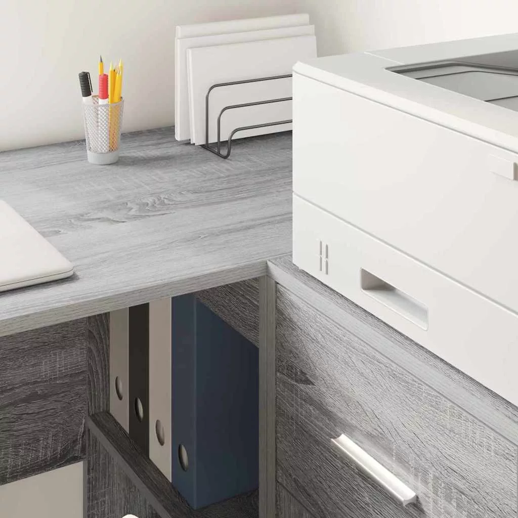 - Teljes tárolási megoldás: A sarokasztal polcokkal és egy magasládával bővített, rengeteg helyet nyújt az irodai kellékeknek. A zsanéros ajtók biztosítják a dokumentumok magánéletét, és segítenek rendben tartani az asztalt, így a stílust és a rendszert keresők ideális választása.