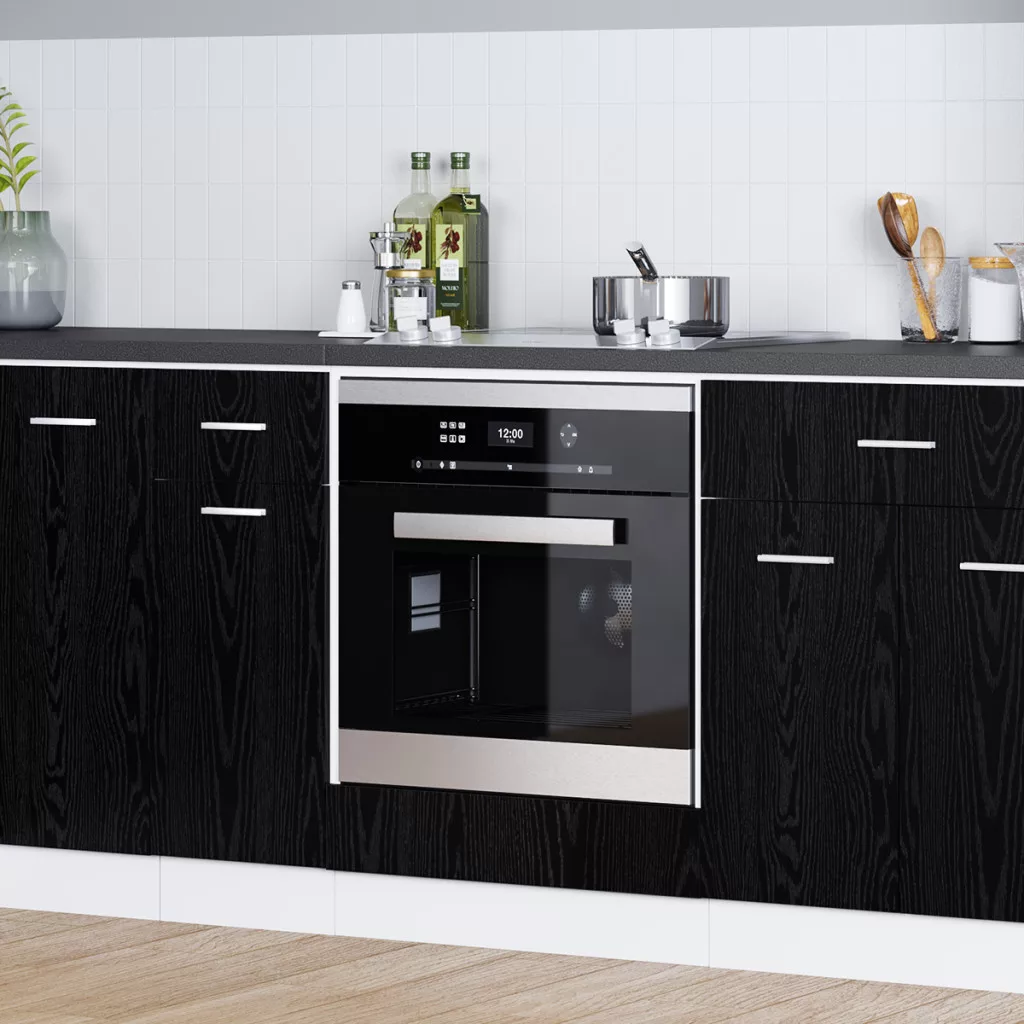 - Anyagok: Szerelt fa, ez a modern konyhai szekrény tartós, és hosszú élettartamot biztosít. Kiváló szilárdsággal bír, és a napi használatnak is ellenáll. Az anyag kellemes simaságot ad, ami illik a modern dizájnhoz, anélkül, hogy túldíszített lenne.