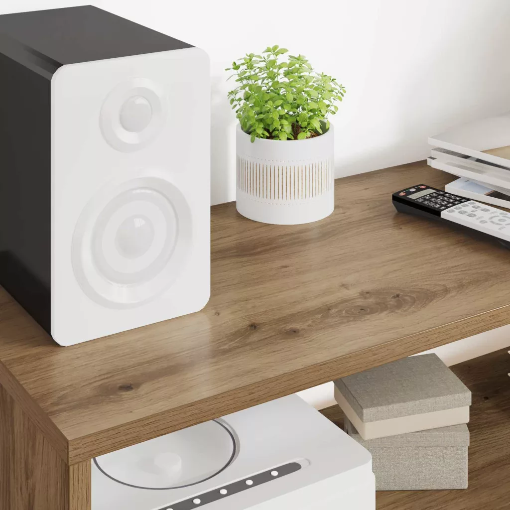 - Tartalmazott alkatrészek: Polcokkal tervezve, egyszerű megoldást biztosít a médiaeszközök és dekorációk rendszerezésére. Minden polc tartós anyagokból készült, így stabil alátámasztást ad a nehéz dolgoknak, mint például a játékkonzolok vagy zenelejátszók, megfelelve a technológiai igényeknek.