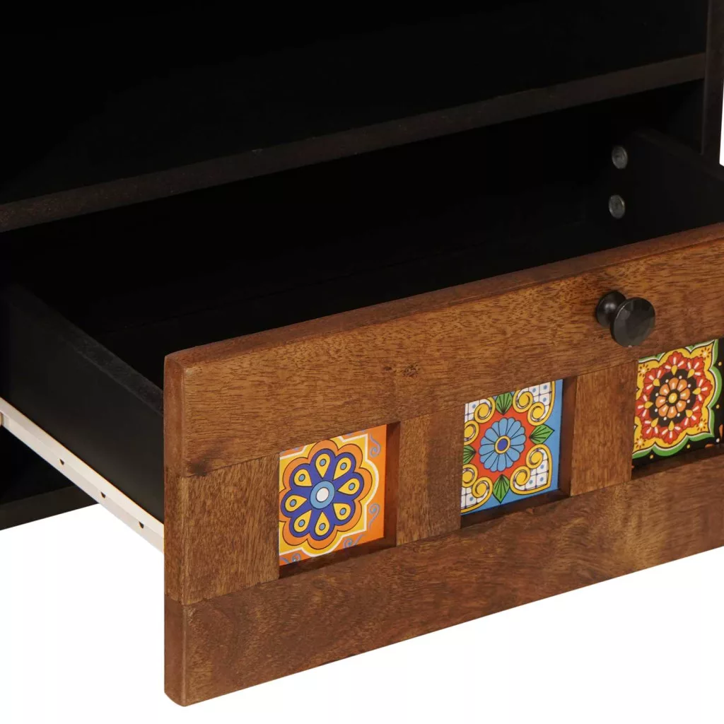 - Anyagok: Ez a szekrény tömör mangóból és MDF-ből készült, így szilárd és elegáns megjelenésű. Az anyagok választása biztosítja a hosszú élettartamot, valamint jól illik a különféle nappali dekorokhoz.