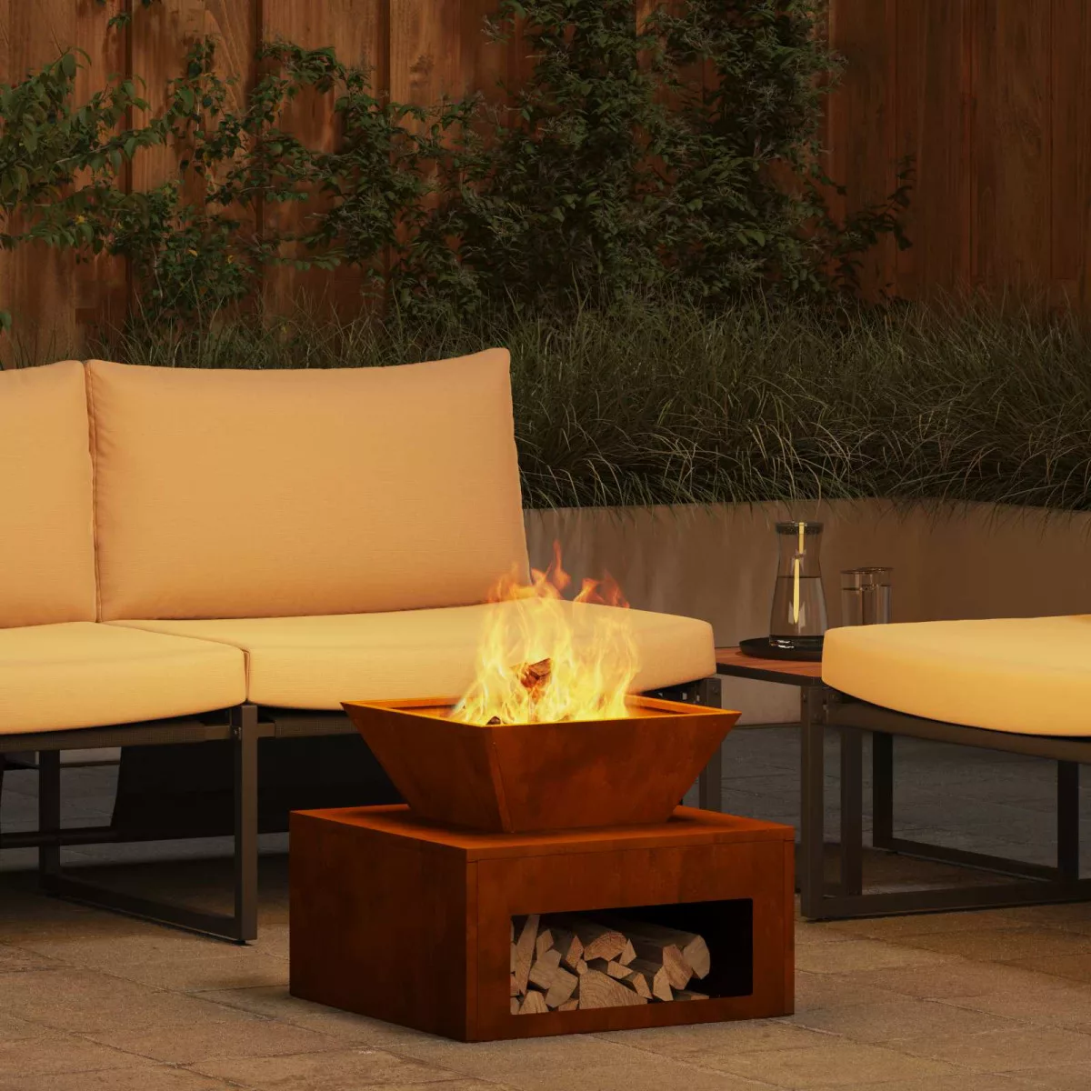 - Modern dizájn: A tűzrakó geometriai kocka alakja a modern kültéri környezethez illeszkedik. Minimalista megjelenése kiemeli a letisztult esztétikát, lehetővé téve, hogy könnyedén beilleszkedjen a különböző kerti dekorációk közé.