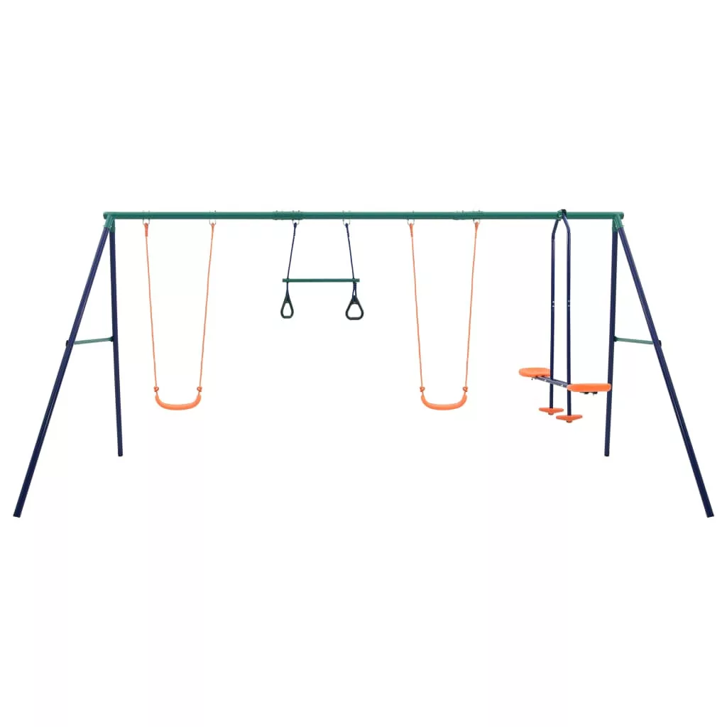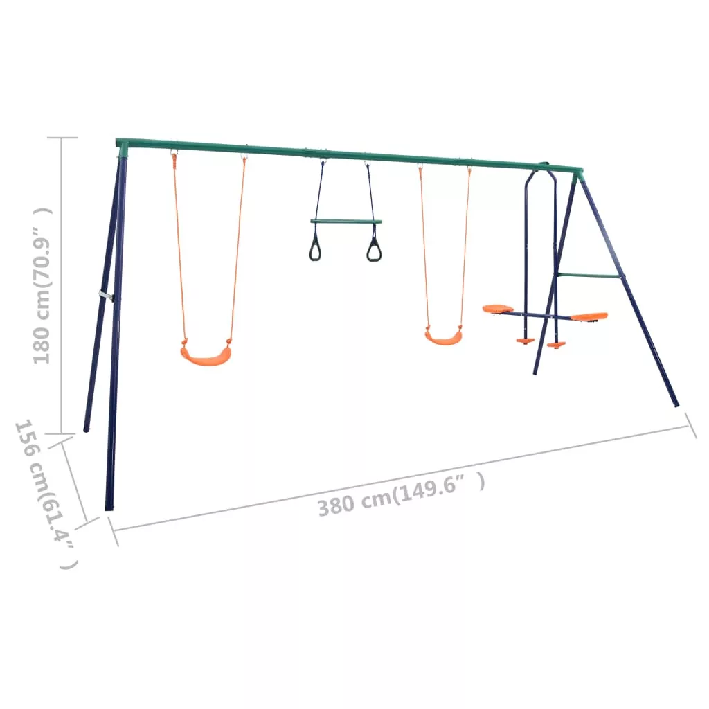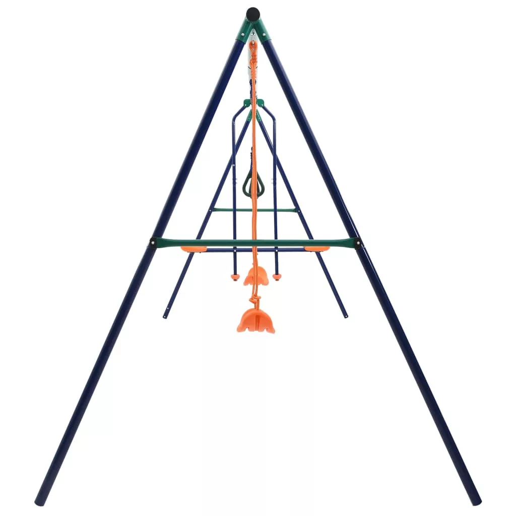 Ez a masszív acélvázzal ellátott, A-alakú hintaszett 2 egyszemélyes hintaüléssel, 2 tornagyűrűvel és egy kakashintával rendelkezik. A kakashintát egyszerre két gyermek használhatja. Erős acélvázának és műanyag üléseinek köszönhetően a szett rendkívül tartós és időjárásálló. A szett könnyen összeszerelhető. Minden része erős rögzítőkkel, csavarokkal, kampókkal és kötelekkel van biztonságosan rögzítve a szilárd, A-alakú keresztrúdhoz.