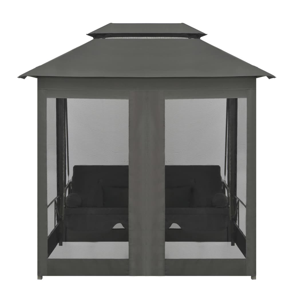 Porbevonatú acélváza nagyon erőssé és strapabíróvá teszi. A tépőzáras függönyöknek köszönhetően mind a négy oldalon könnyedén leengedheti ezeket. A zárt függöny tökéletes a szúnyogok és a rovarok elleni védekezésre és arra, hogy egy kis privát helyet biztosítson. A hintapad a még pihentetőbb élmény érdekében barátságos és kényelmes ággyá alakítható. Két szögletes, valamint két henger alakú párnája biztosítja a további kényelmet.
