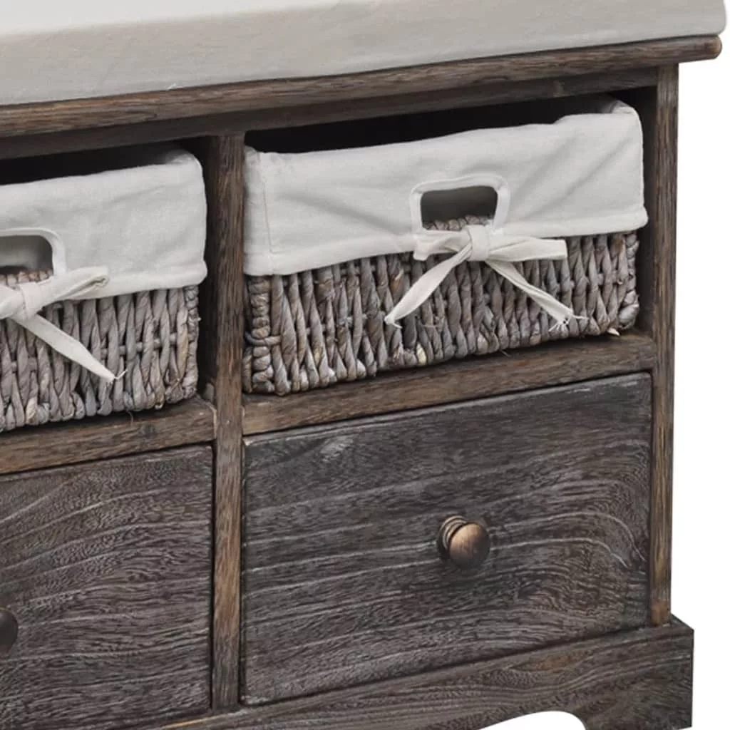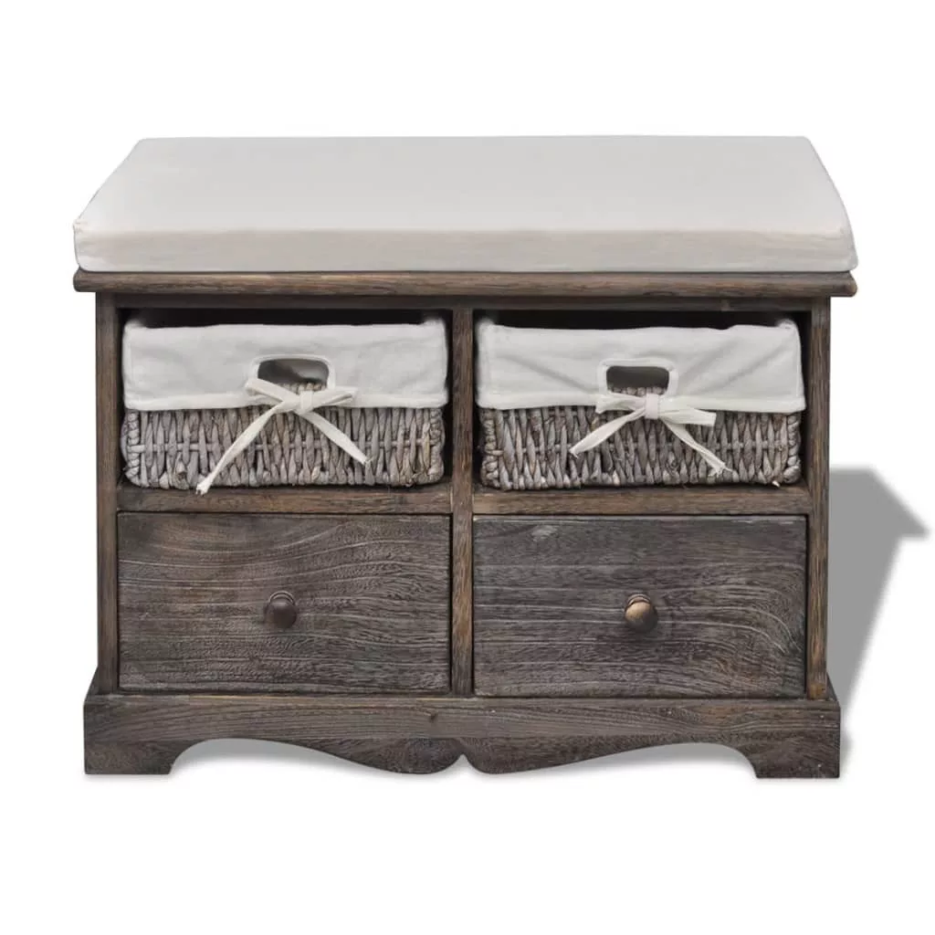Ez a tartós tárolópad két fonott kosárral és két fa fiókkal lett ellátva, így rengeteg helyet kínál dolgai tárolására, és ugyanakkor vidéki stílussal ruházza fel otthonát. Emellett a pad az ülőpárnának köszönhetően rendkívül kényelmes. Tökéletes lesz a verandában, a társalgóban, a hálószobában bármilyen más helyiségben.