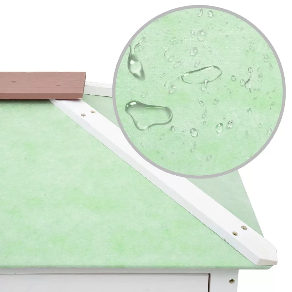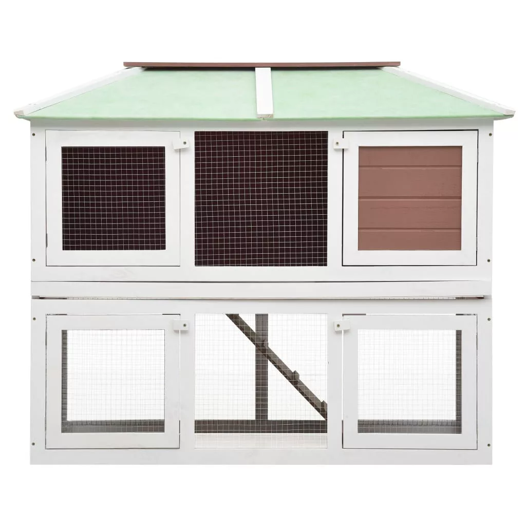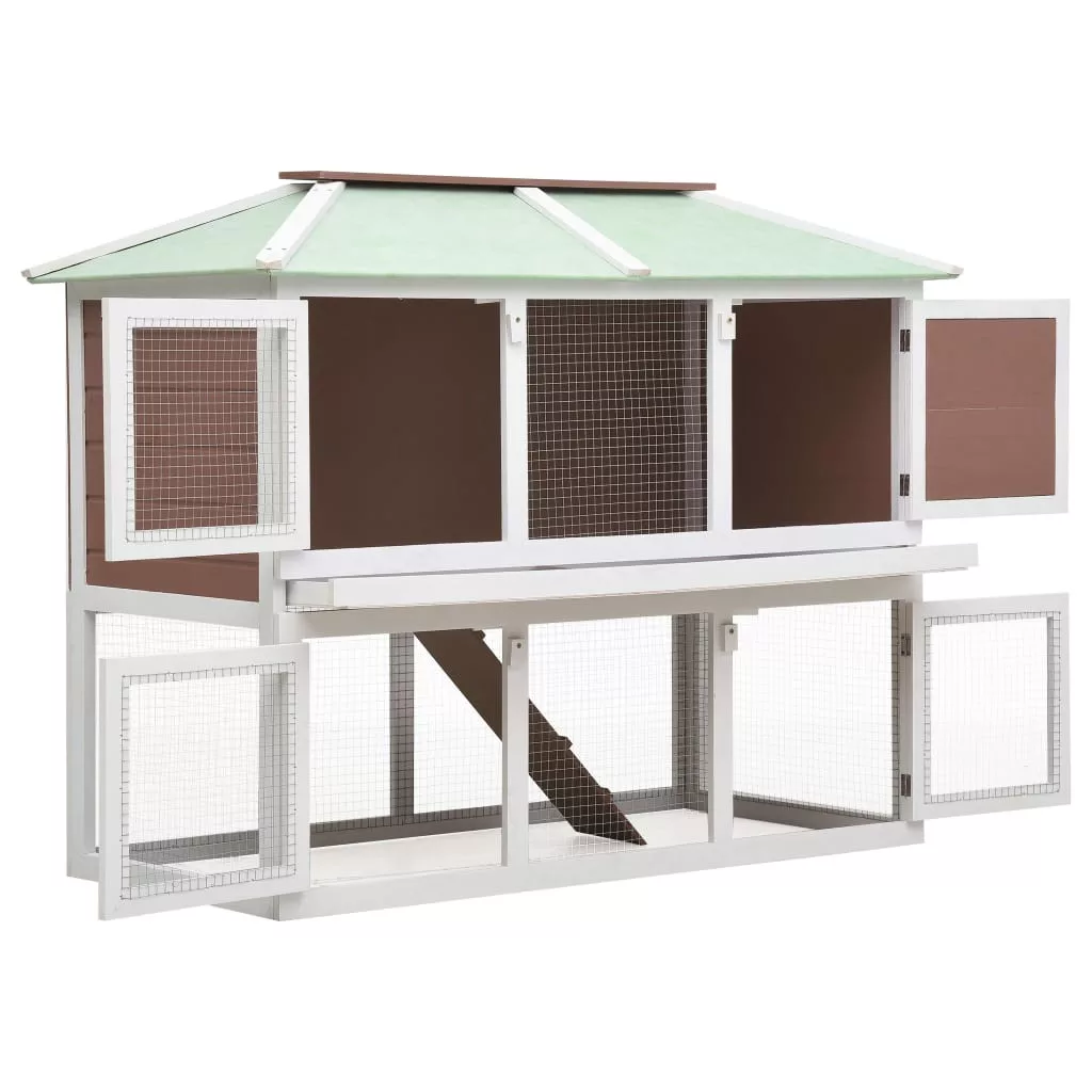 Az állatketrec kiváló minőségű fakeret felhasználásával készült, ami évekig kitart. Zöld teteje távol tartja az esőt, miközben a kényelmes búvóhely tökéletes alvóhelyet biztosít. Könnyen megmászható létra vezet az alsó földszintről a felső szintre. A kihúzható tálca megkönnyíti a tisztítást. Ez a fa nyúlketrec tökéletes kisállatok tartására.