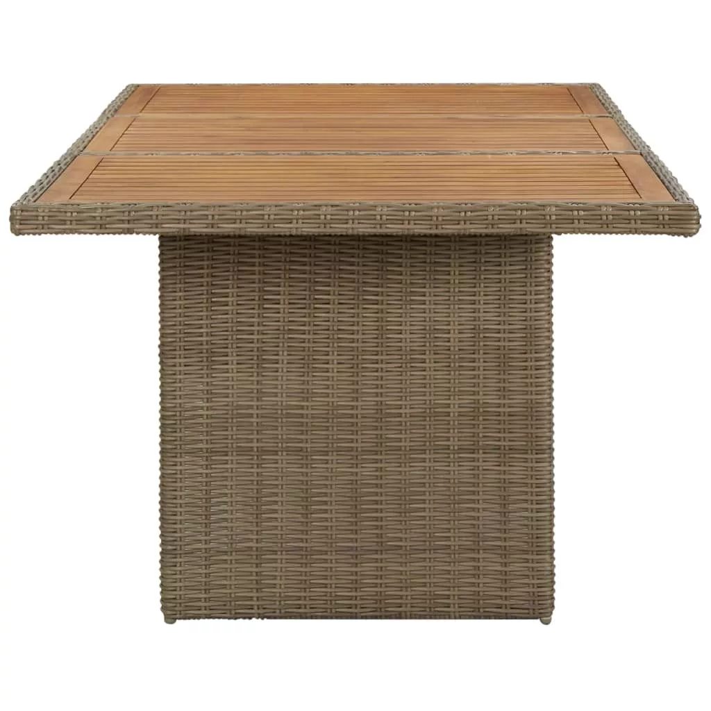 Ez a kerti asztal PE rattanból készült, így időjárásálló és tartós. A porszórt acélváznak és a tömör akácfa asztallapnak köszönhetően az asztal masszív és stabil. A könnyű szerkezetének hála az asztal könnyen mozgatható.