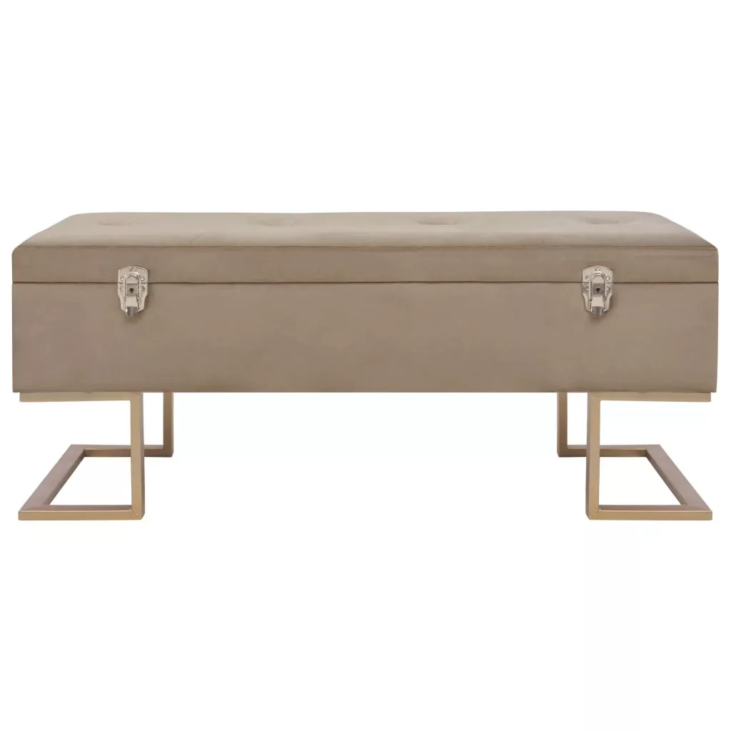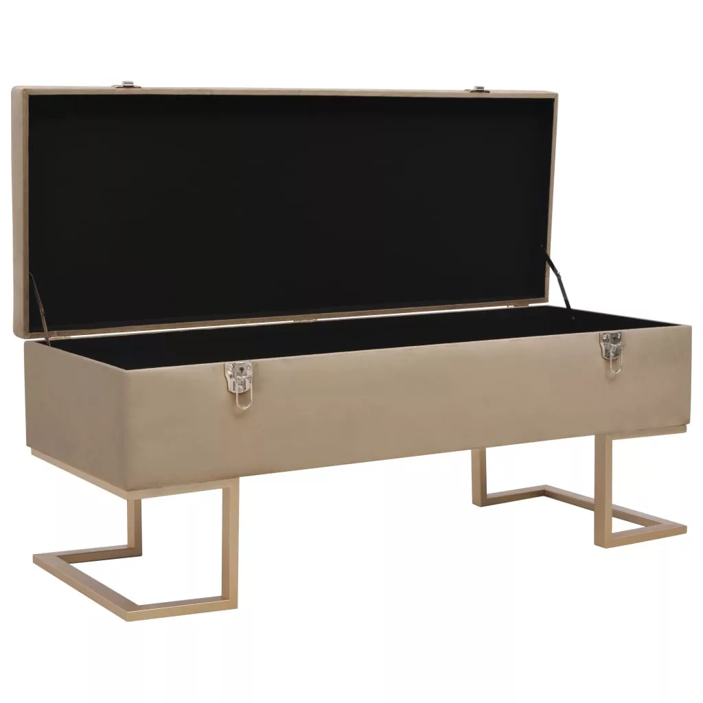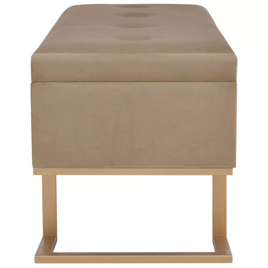 Ez a bézs bársonykárpitos pad puha tapintású és rendkívül hangulatos, miközben élettel tölti meg belső terét. Belső tárolórekesszel rendelkezik, ami extra helyet kínál különböző tárgyak tárolására. Emellett, az aranyszínűre festett, porszórt bevonatú vaslábaknak köszönhetően ez az előtéri pad rendkívül stabil és tartós. Padunk elbűvölő kiegészítője lesz otthonának.