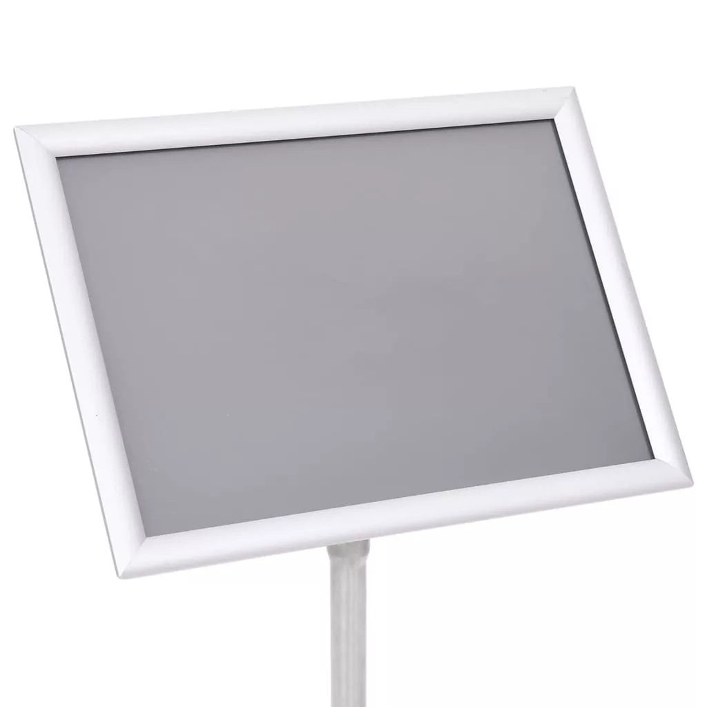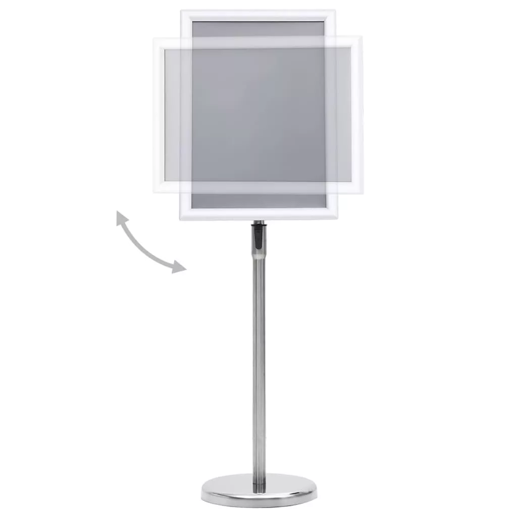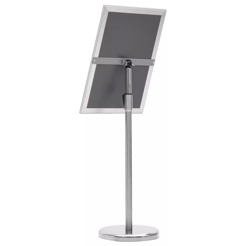 Ez a poszterállvány teljesen állítható, hogy megfeleljen a különböző igényeknek. A tartós és könnyű alumíniumötvözetből készült állvány egy standard A3-as grafikát jelenít meg. Nagy rugalmasságú panelje bármilyen szögben elforgatható. Az átlátszó PVC fólia megvédi a panelt a portól és az ujjlenyomatoktól, és tisztán tartja a megjelenítendő posztereket. Az összepattintós rendszernek köszönhetően az állvány gyorsan felállítható. Emellett kis méretével kevés helyet foglal, és könnyen szállítható.