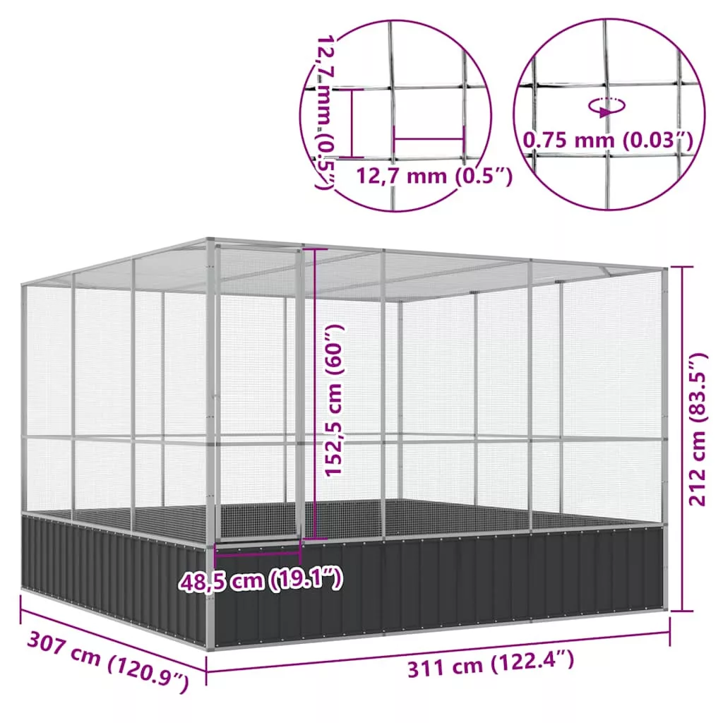 - Robusztus váz: Az acél rendkívül kemény és erős anyag. Erős szerkezetet és stabilitást biztosít. A horgonyzás jobb védelmet nyújt a korrózió ellen, és hasznos a szabadban és zord környezetben használt termékeknél. A masszív horganyzott acélszerkezetnek köszönhetően ez a madárház tartósra készült.