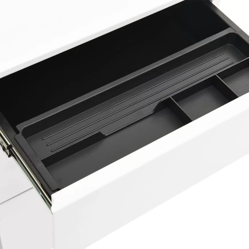 Ez az irodai szekrény acélból készült, így tartós és könnyen tisztítható. A 3 fiókkal és zárral ellátott iratszekrényben rendezetten és biztonságban tarthatja iratait. Minden fiók 1 kivehető akasztórúddal van felszerelve, amely szabadon kombinálható levél méretű, legal méretű és A4-es függő iratmappa tárolására. A szekrény egy tolltartóval is rendelkezik az asztala rendben tartásához. A 3 részes golyóscsapágyakkal ellátott fiókok zökkenőmentes nyitást és zárást biztosítanak, így még fokozott terhelés mellett is teljesen kihúzhatók.