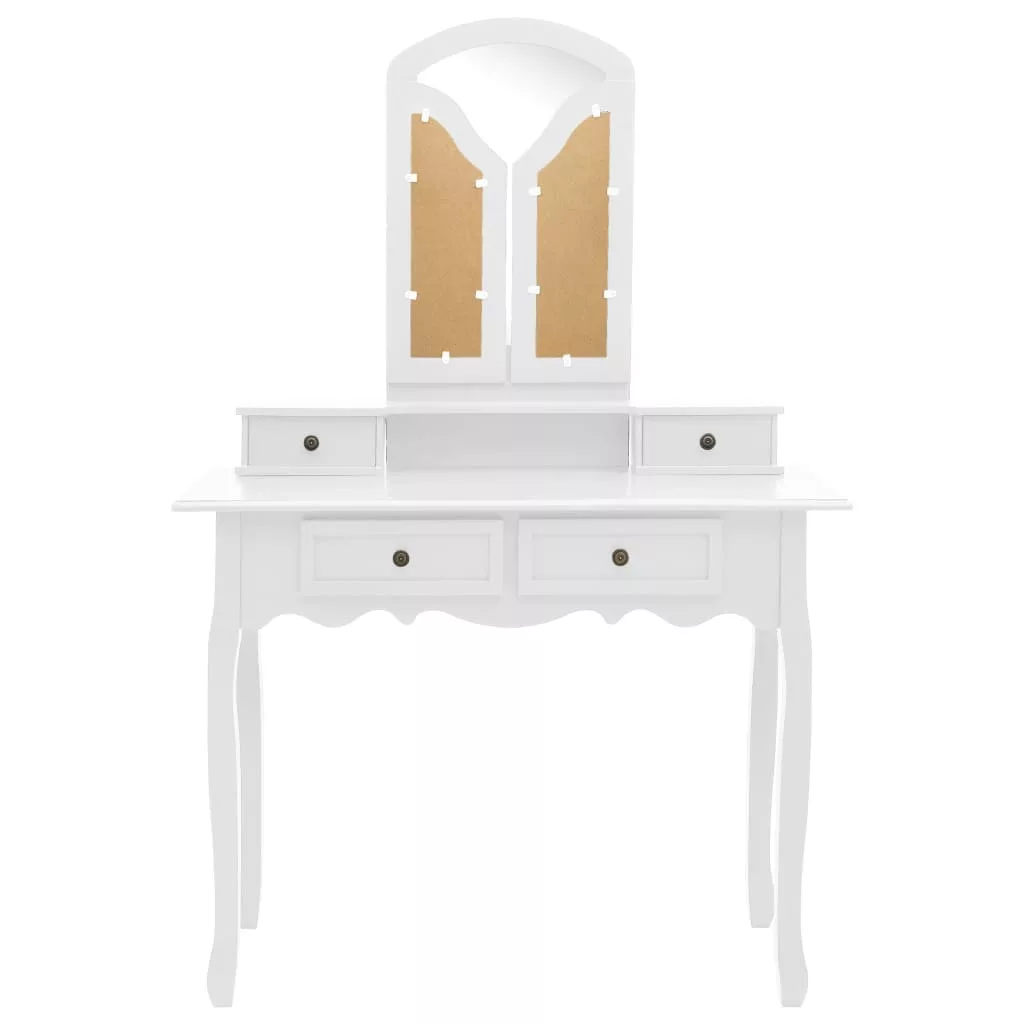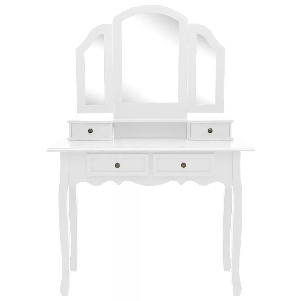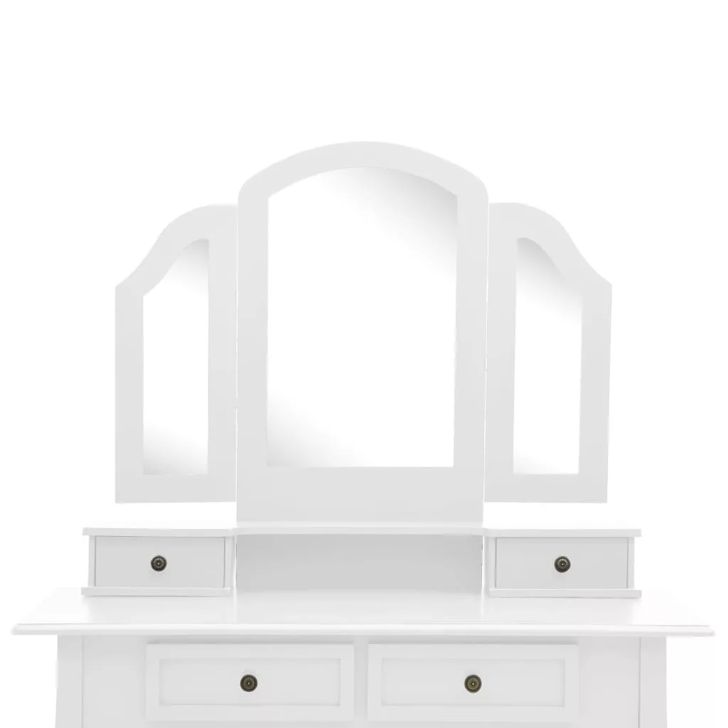Ez a sminkasztal egy 3 az 1-ben asztali tükörrel rendelkezik, amelyből a 2 oldalsó tükör összecsukható a tartós zsanérokkal. A kívánt szögbe is fordíthatja őket. Meglepő módon a tükörkeret és az asztal külön is használható. Ezenkívül a 4 elegáns fiók további helyet kínál dísztárgyainak, kozmetikumainak és egyéb fontos tárgyainak. Ez a pipereasztal- és székszett garantáltan szemet gyönyörködtető darab lesz, bárhová is kerül.