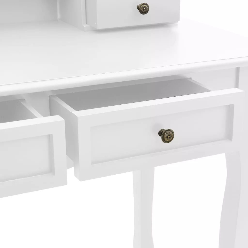 Bájos fésülködőasztalunk és ülőkénk kiváló minőségű császárfából készült. Viktoriánus stílusa és tiszta fehér felülete eleganciát és szépséget visz budoárjába vagy öltözőjébe. A kifinomult kézművesmunka tovább növeli az asztal és az ülőke szépségét.