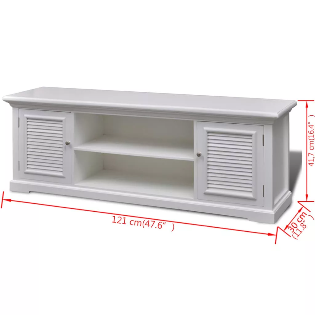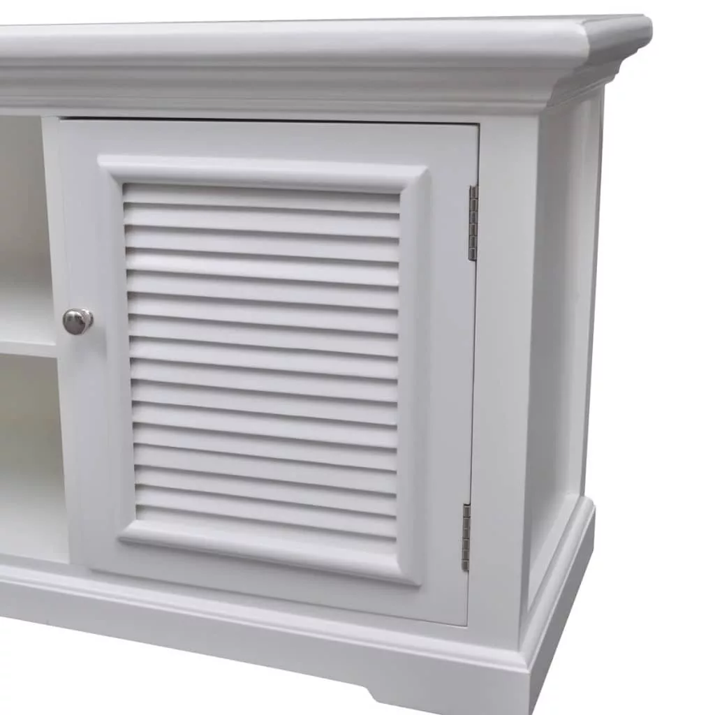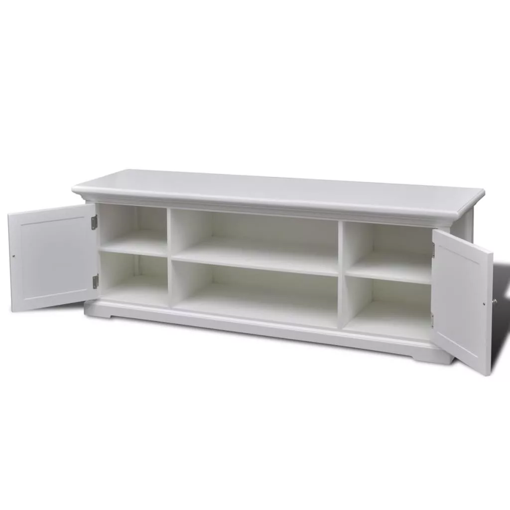 Az erős MDF-ből és fenyőfából készült TV-állvány jól bírja a mindennapi használatot. A fehérre festett felület nedves ruhával könnyedén tisztítható.