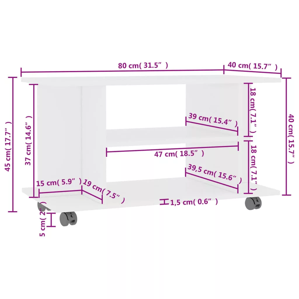 A TV-szekrény szerelt fából készült, amely erőt, tartósságot és hosszú élettartamot biztosít. A 4 nyitott polccal kialakított szekrény bőséges tárhelyet kínál folyóiratok, könyvek, DVD-lejátszók, vevőegységek, lemezek és multimédiás eszközök jól szervezett és elérhető helyen történő tárolására. Ezenkívül könnyen mozgatható a 4 simán gördülő görgővel, és szilárdan a helyén marad a 2 zárható görgővel.