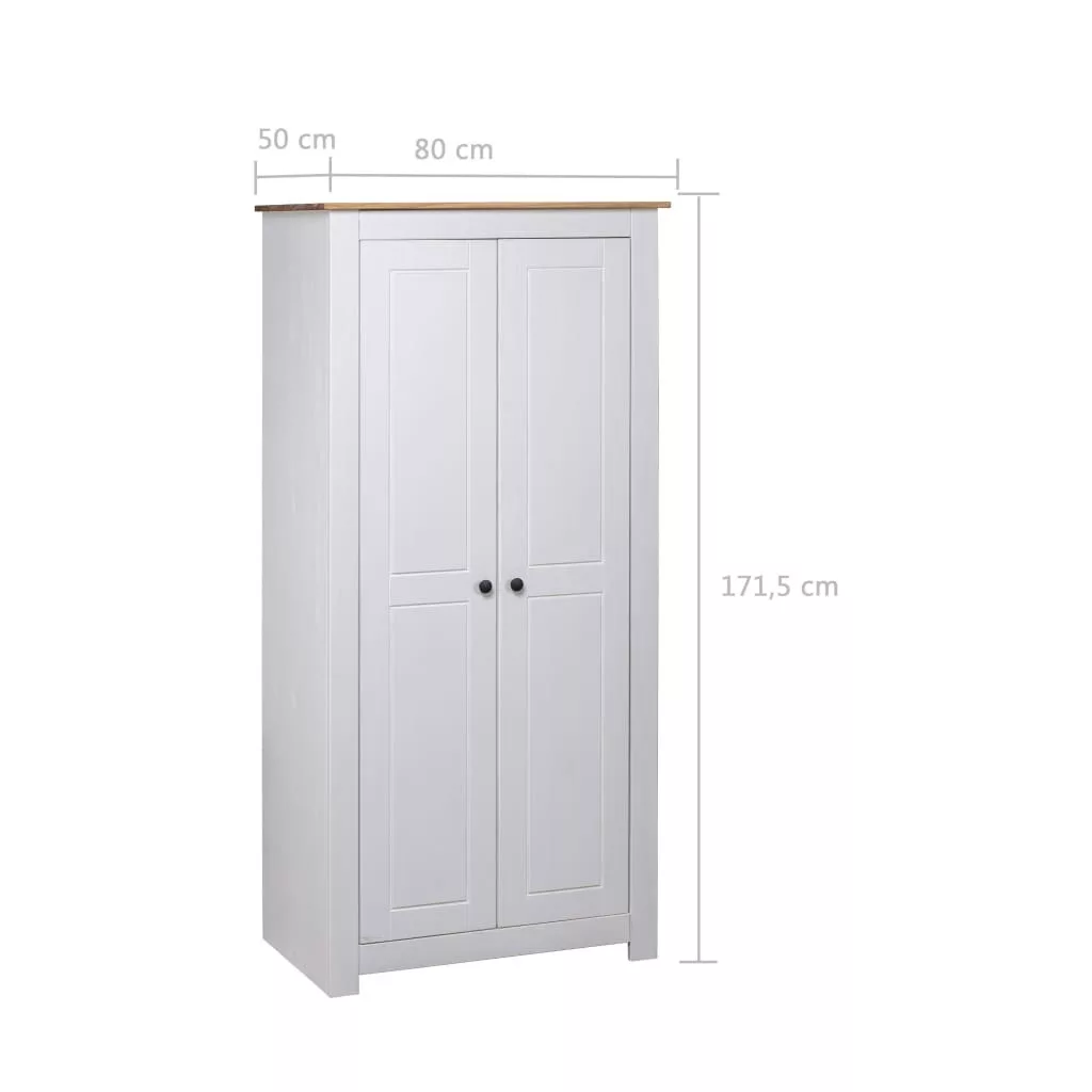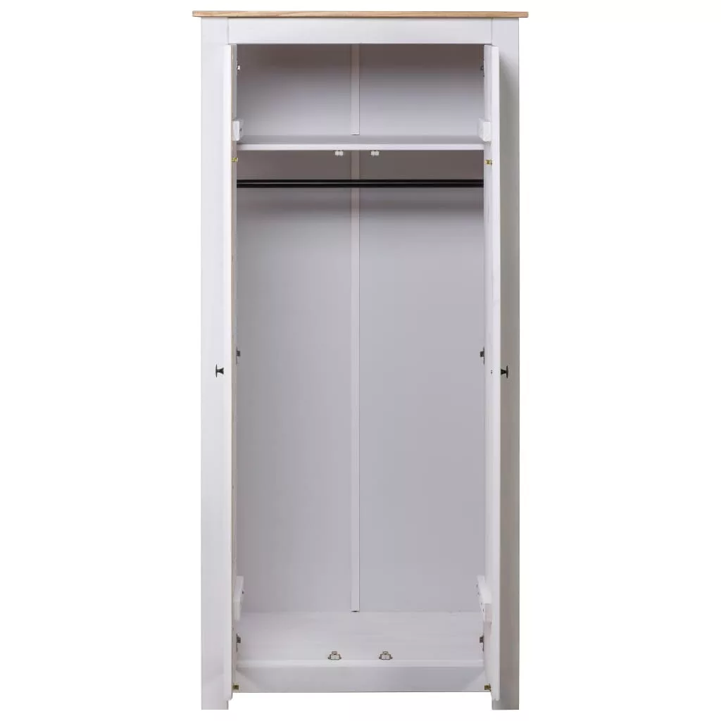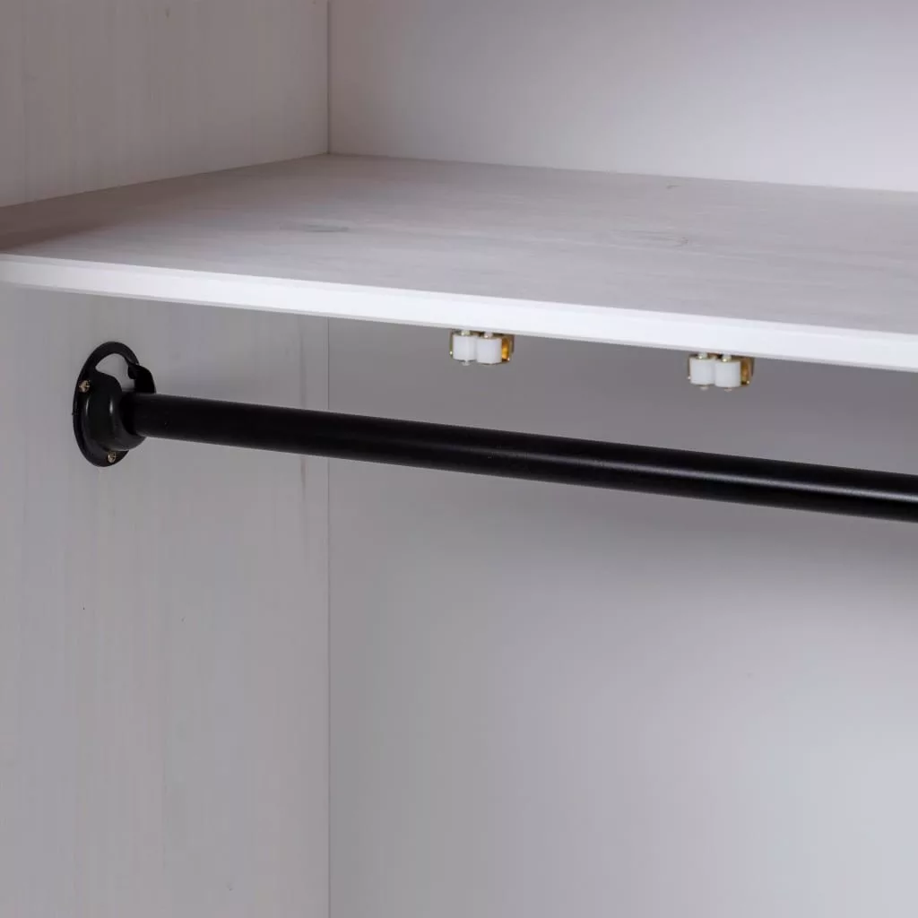 A ruhásszekrényben rögzített polc található cipők, pulóverek, farmerek, sapkák, kézitáskák stb. tárolására és rendszerezésére. A nagy rekesz akasztóval lett felszerelve, így kabátok, ruhák stb. akasztására használhatja. A tömör fenyőfából készült gardrób masszív és hosszú távú használatot biztosít.