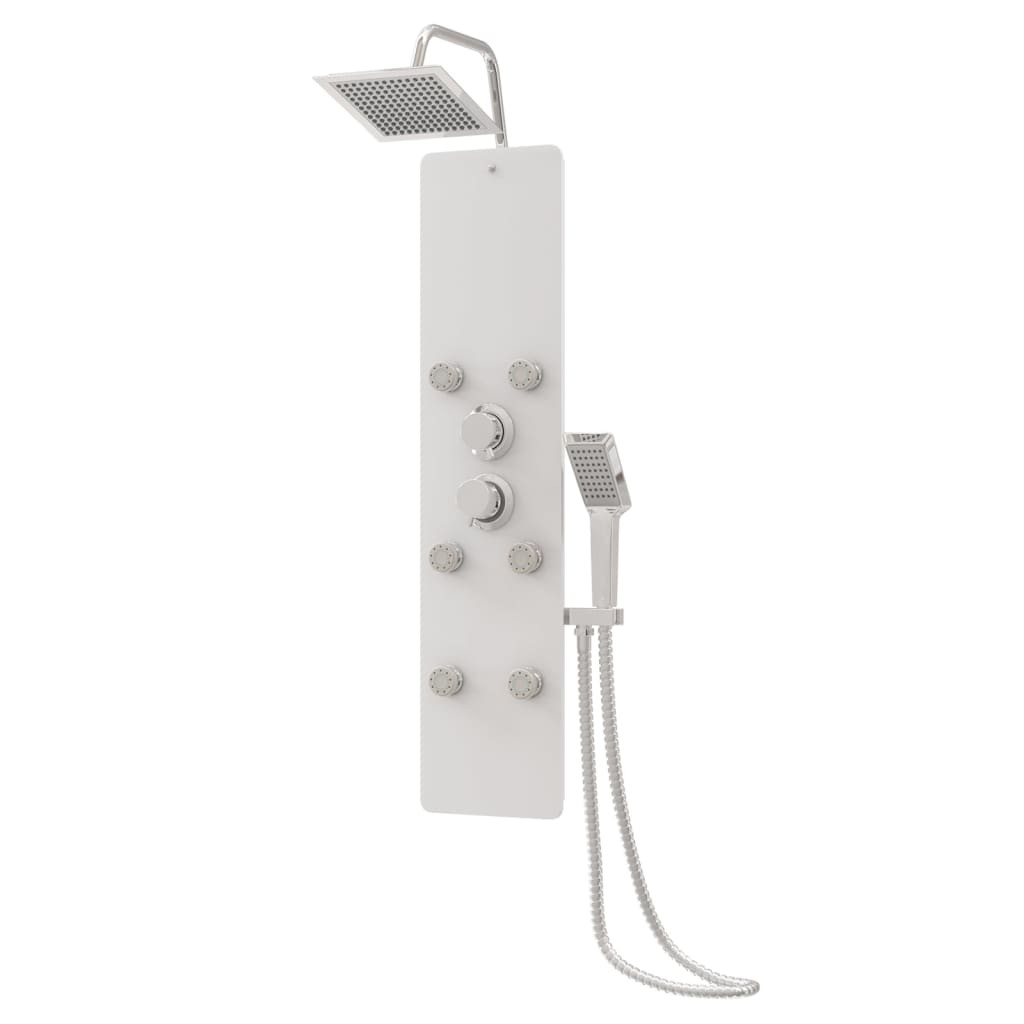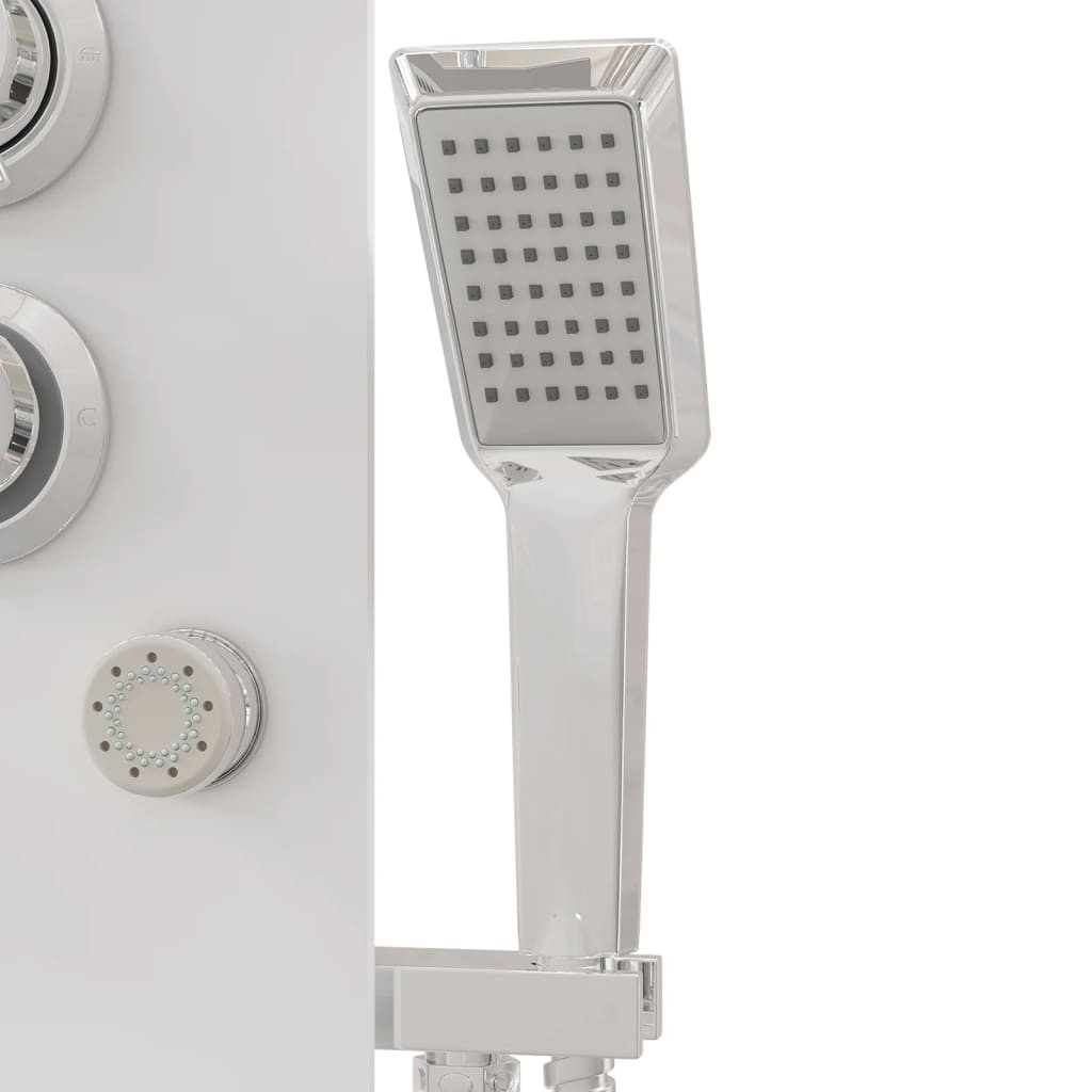A zuhanypanel rozsdamentes acélból és edzett üvegből készült. Az edzett üveg olyan kontrollált hő- vagy vegyi kezelés eredménye, ami a normál üveghez képest tartósabbá és biztonságosabbá teszi. Három zuhanyozási módot kínál, amelyek egyszerűen kiválaszthatóak: esőztető zuhany, hidromasszázs és kézi zuhanyozás. A szilikon fúvókák ellenállnak a vízkő lerakódásának.