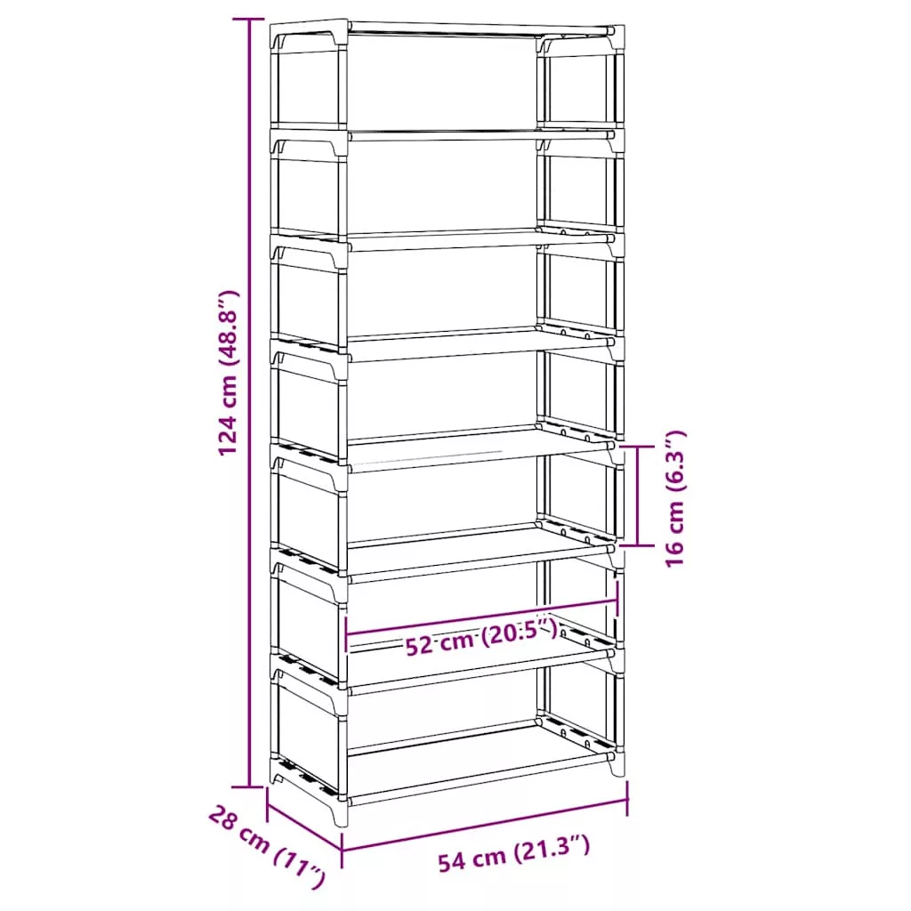 - Bőséges tárolóhely: A 8 szintes kialakításnak köszönhetően ez a cipőtároló bőséges tárolókapacitást biztosít, lehetővé téve, hogy a teljes cipőkollekcióját rendben és jól rendszerezve tartsa egy kényelmes helyen.