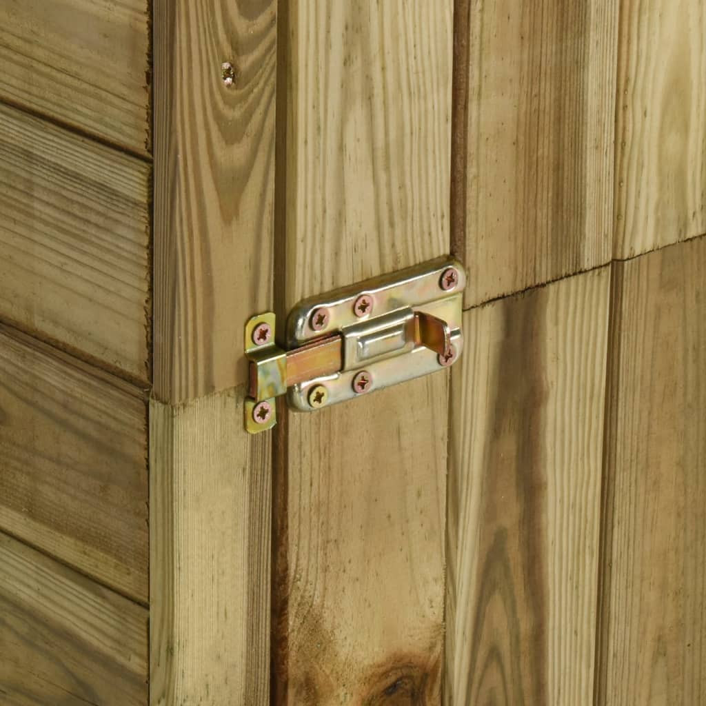 Ez a kültéri tárolókamra fenyőből készült. Az impregnált fenyő strapabíró, időjárásálló és nem korhad. Ezenkívül a tető vízhatlan kátránypapír filccel van bélelve.