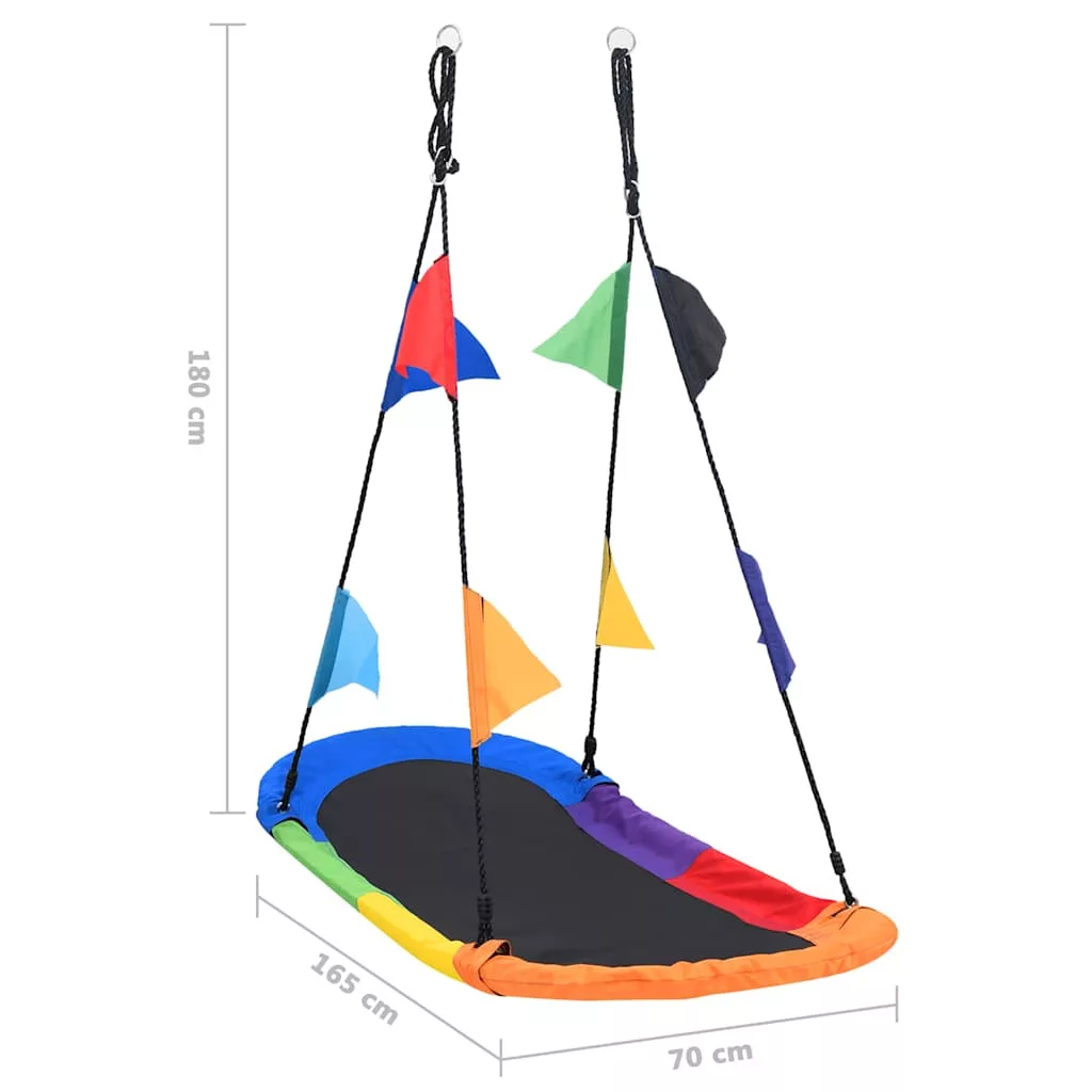 Ez a fára akasztható hinta puha habszivacs borítású acélvázzal rendelkezik, így képes stabilitást és kényelmet garantálni. A felső réteg 6 különböző színű kopás- és vízálló oxford-szövetből van összevarrva, mely nagyobb teherbírást kínál. A fekete hintaülés polipropilén szövetből készült, így tisztítása rendkívül könnyű. Ráadásul a kötélen függő nyolc zászló a hintát követve leng előre és hátra, ami fokozza a hintázás élményét és még nagyobb szórakozást kínál gyermekének. Mindegyik állítható tartókötél végén egy gyűrű található, amellyel biztonságosan a hintához erősítheti, a négy tartópont pedig egyenletes húzóerőt biztosít, az egyensúly és a biztonság garantálása érdekében.