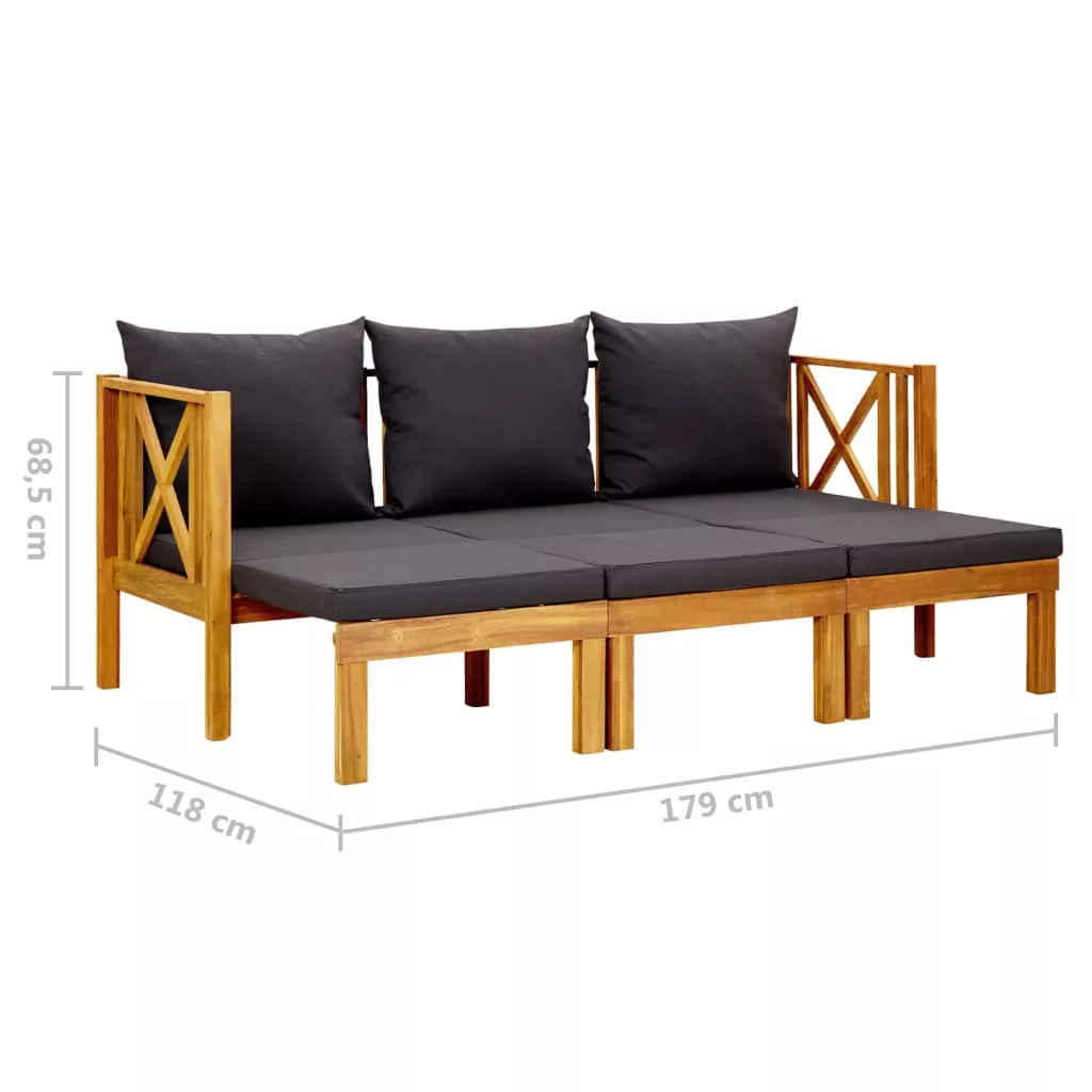 Ez a pad tömör akácfából készült, így stabil és tartós. Az olajozott felületnek köszönhetően nedves ruhával könnyen tisztítható. Ez a többfunkciós ülőgarnitúra kihúzható kanapénak is használható. Élvezheti a pihenést a padon ülve egy csésze kávé mellett. Emellett a vastag párnákkal ellátott napágy kényelmes ülésélményt biztosít.