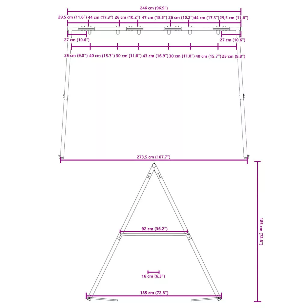 - Nagy teherbírású fém anyag: Ez a hintaváz festett acélcsövekből készült, amelyek rozsdaállók, rendkívül erősek, és ellenállnak a deformációnak, kiváló stabilitást és tartósságot biztosítva.