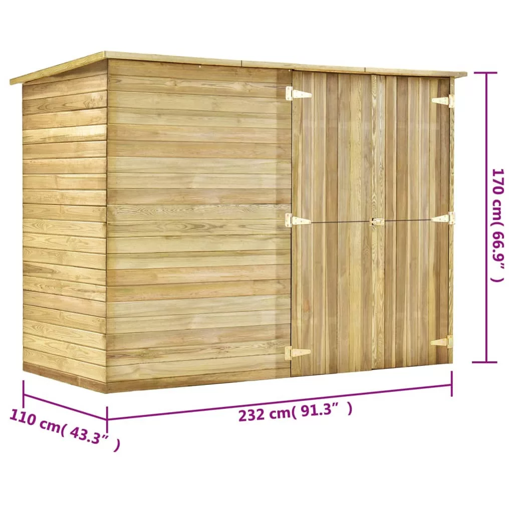 A minőségi impregnált fenyőfából készült fészer tartós és időjárásálló. A tetőt kátránypapír borítja, amely megvédi a kerti tárolót a nedvességtől. Kétszárnyú ajtaján keresztül könnyű belépni a biciklitárolóba, a zár pedig extra biztonságot nyújt.