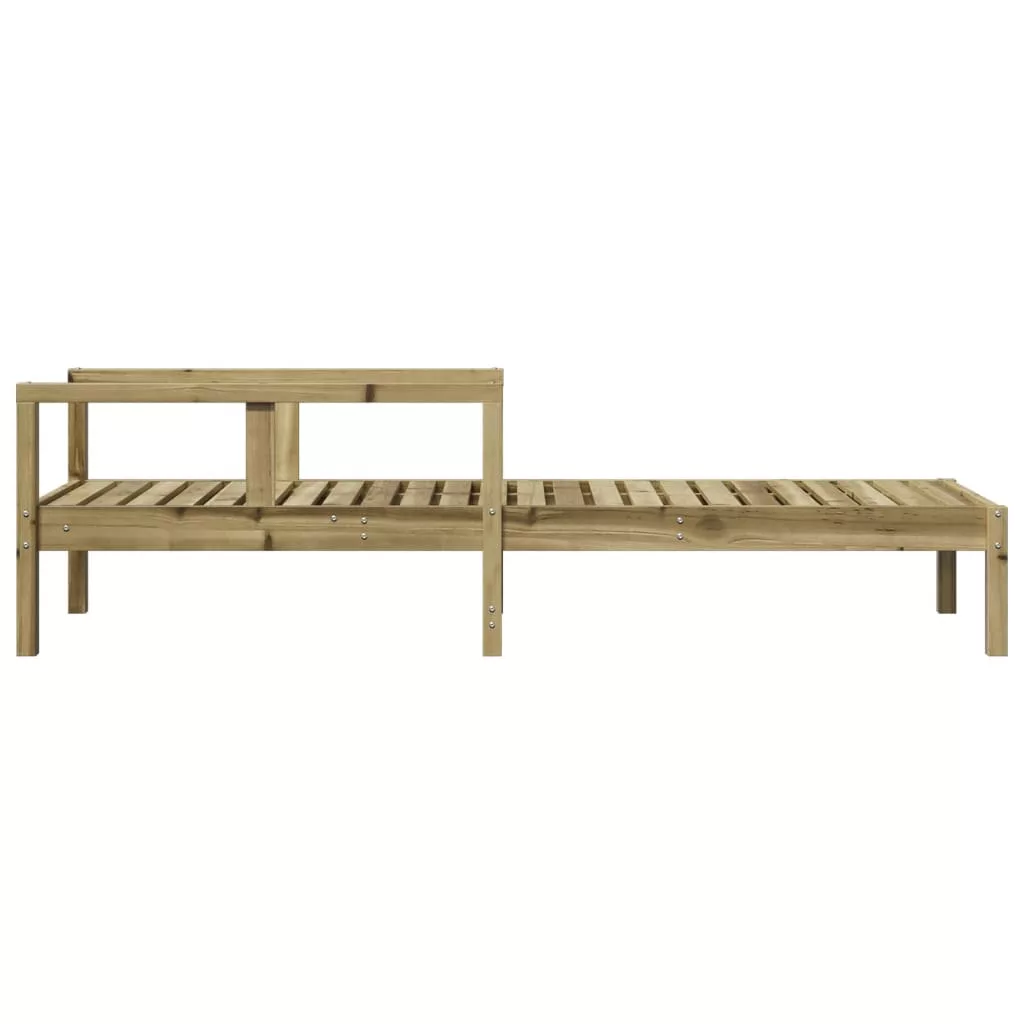 - Impregnált fa: A napozóágy tömör fenyőfából készült. A tömör fenyőfa egy gyönyörű, természetes anyag. A fenyőfa egyenes erezetű, a csomók pedig jellegzetes, rusztikus megjelenést biztosítanak az anyagnak. Az impregnálás egy tartósítási eljárás, amely egy zárt, túlnyomásos berendezés használatával történik. A nyomáskezelés növeli a korhadással és a vízzel szembeni ellenállást.