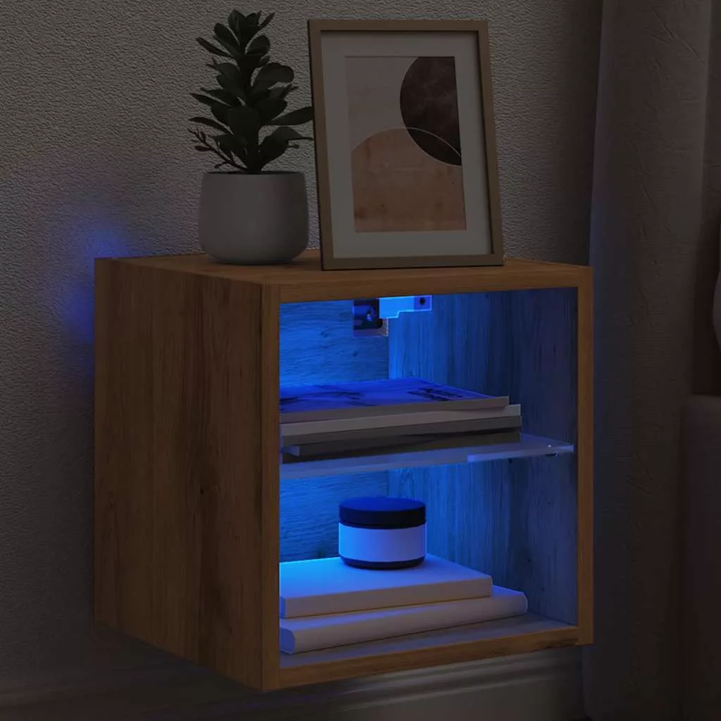 - RGB LED-világítás: A falra szerelhető média-szekrény élénk RGB LED-világítással lett felszerelve. A sokféle testre szabható menü segítségével egyszerűen megváltoztathatja a világítás színét, sőt, automatikus váltakozást is beállíthat. Ezek a LED-lámpák nemcsak a lebegő TV-egység modern megjelenését, de divatosságát is növelik.