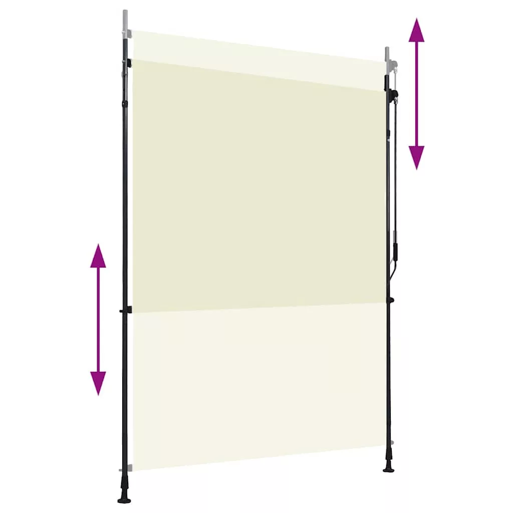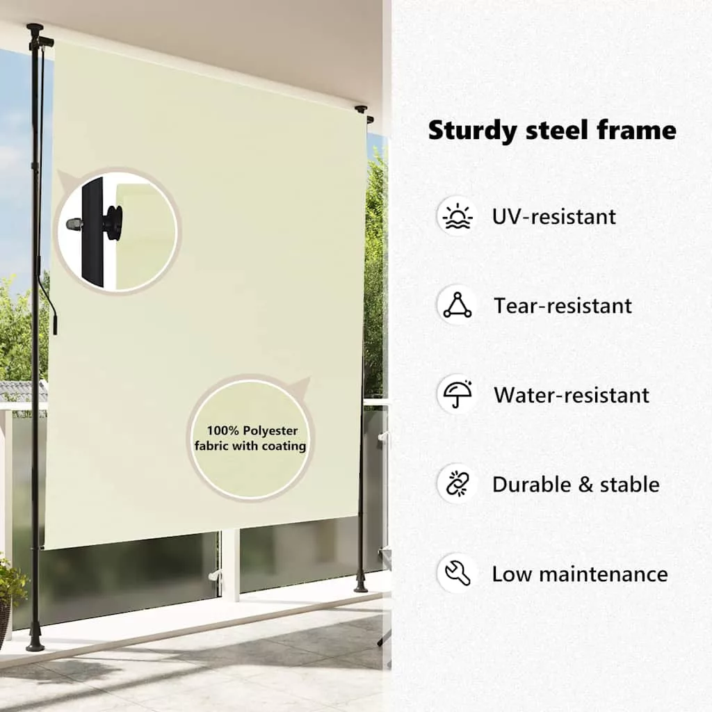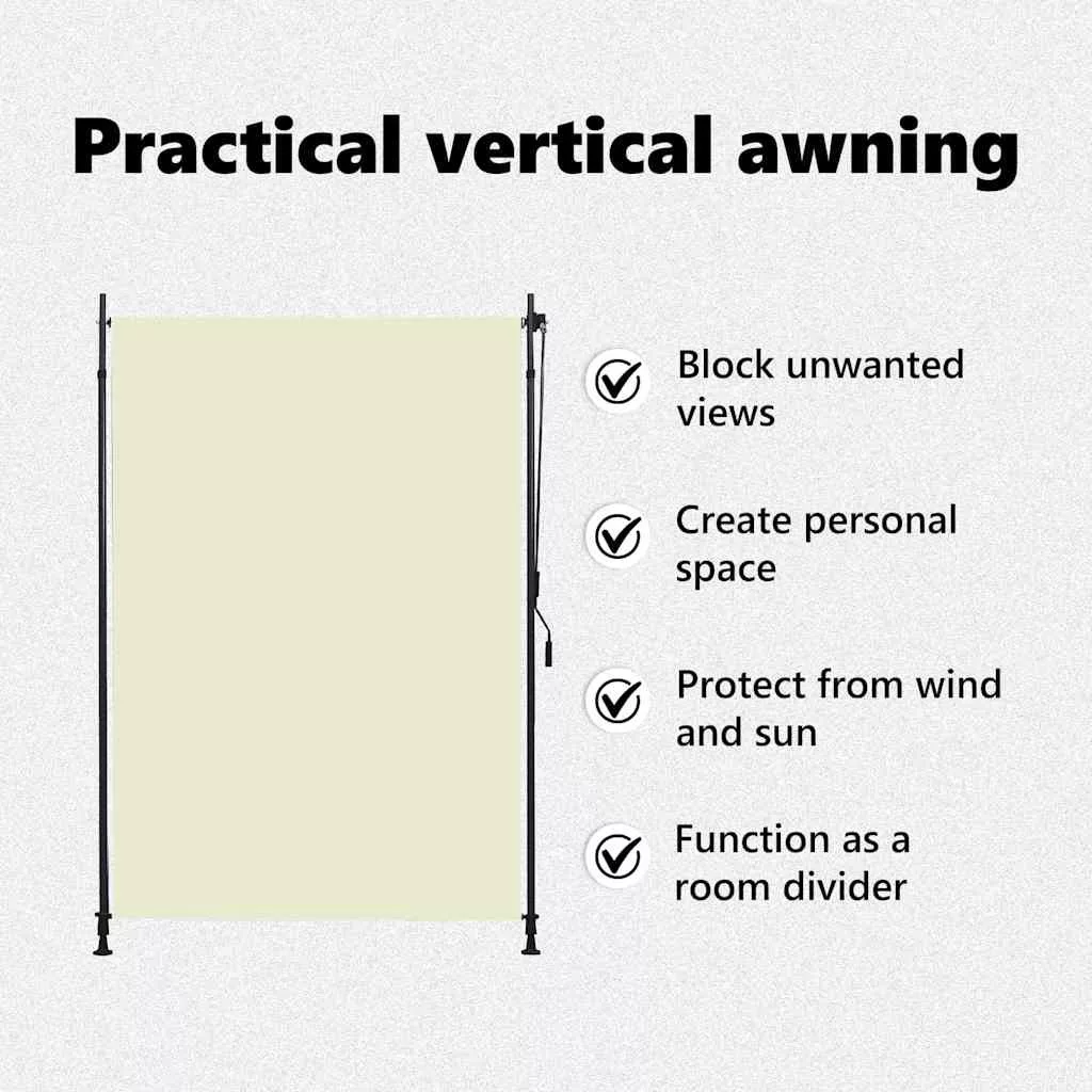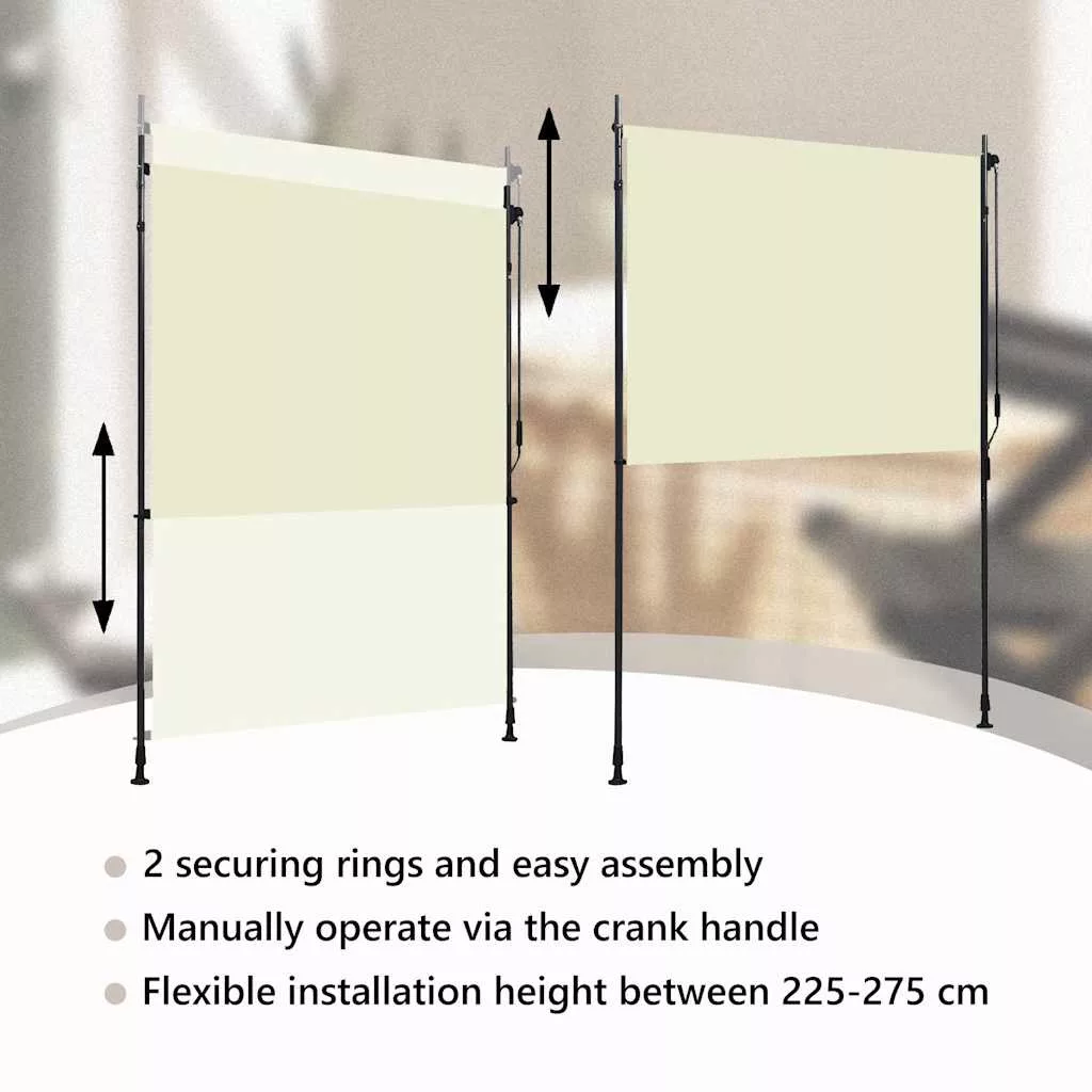 A poliamid bevonattal ellátott kiváló minőségű anyag fakulásálló és védelmet nyújt a nap káros sugaraival szemben, miközben légáteresztő-képességét is megtartja. Könnyen fel- és letekerhető a kézi karral. Ez a függőleges redőny két álló állvánnyal rendelkezik, melyek magassága 225 és 275 cm között állítható. A legtöbb mennyezetmagasság esetében használható, és könnyen felszerelhető.