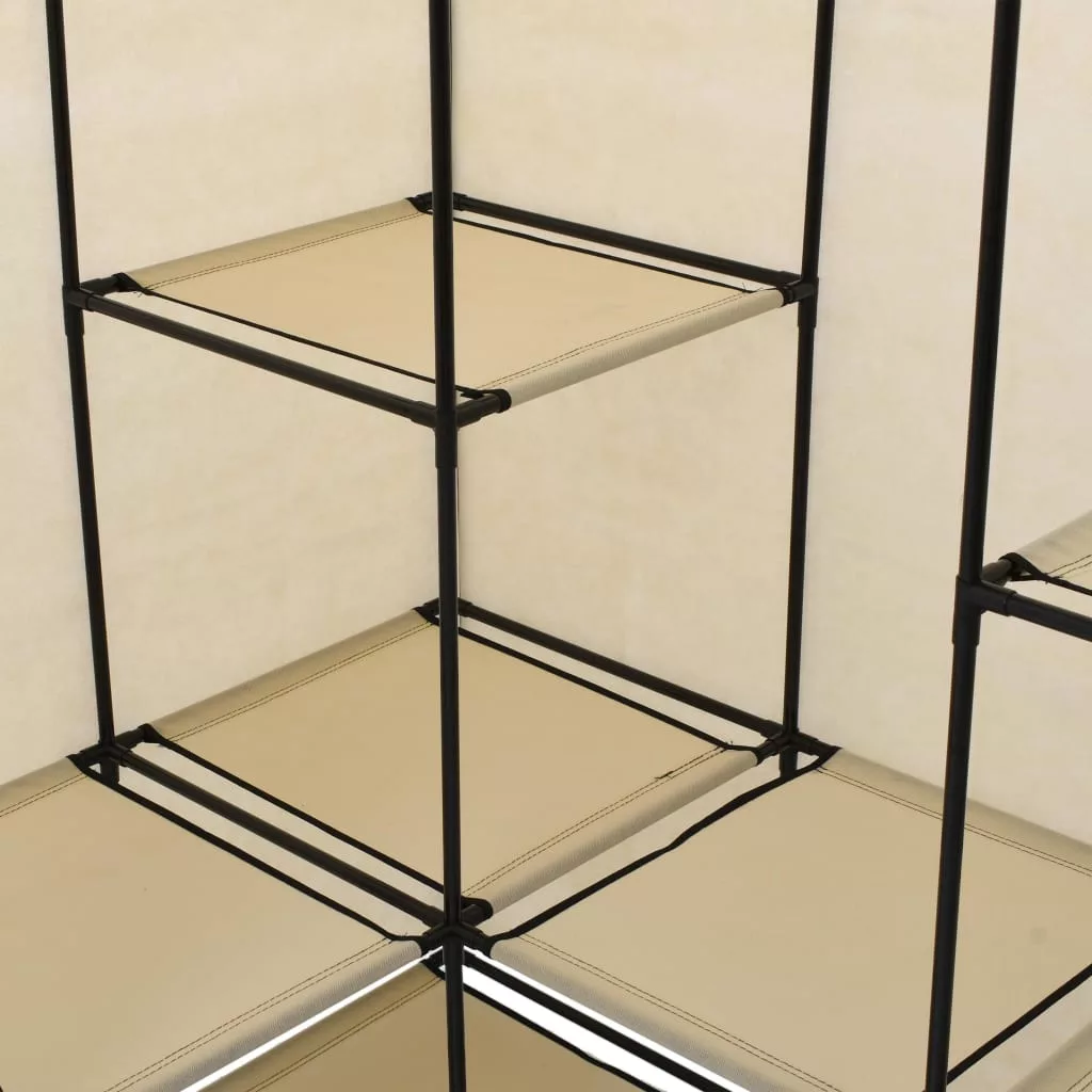 A strapabíró vasváz meglepően erőssé teszi ezt a ruhaállványt. Egy normál szövetszekrénnyel összehasonlítva a sarokszövetszekrény szerkezete még stabilabb. A helytakarékos ruhásszekrény optimalizálja a sarok kihasználtságát, így nagy tárolófelületet és akasztóhelyeket kínál táskái, cipői és egyéb kisebb tárgyai rendezetten és elérhető távolságban tartására. A cipzáras szövetborítás megóvja ruháit a kosztól és a portól.