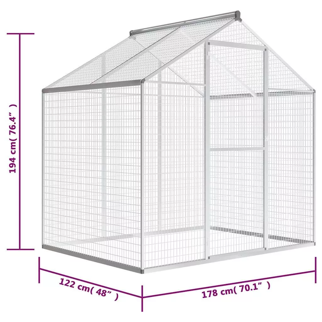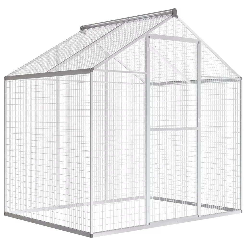 Az erős és karbantartást nem igénylő alumíniumszerkezetnek köszönhetően ez a madárház nehéz ajtókkal van ellátva. Annyira erős, hogy még a tetőről függő személyt is megtart.