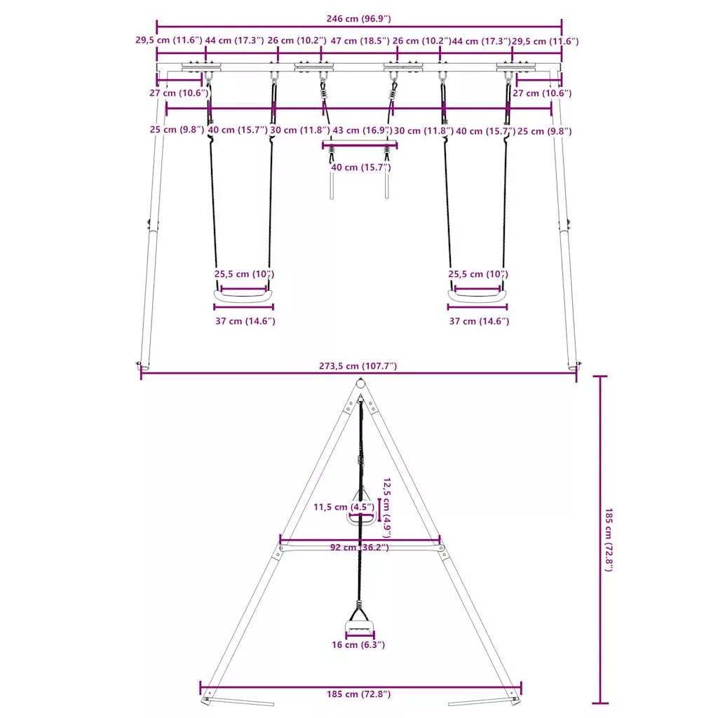 - Széleskörű felhasználás: Ez a hintaváz különféle helyeken helyezhető el, például kertben, hátsó udvaron, óvodában, játszótéren stb.