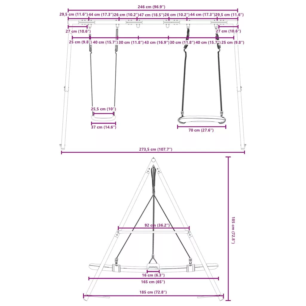 - Széleskörű felhasználás: Ez a hintaváz különféle helyeken helyezhető el, például kertben, hátsó udvaron, óvodában, játszótéren stb.