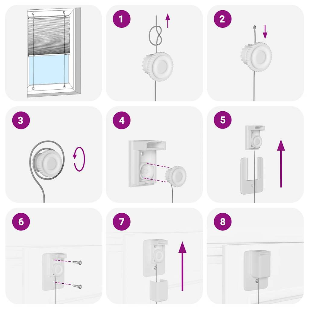 FIGYELEM!A kisgyermekek megfulladhatnak az eszközt működtető zsinórok, láncok, szalagok és a belső zsinór hurkaiban. A fulladás és a belegabalyodás elkerülése érdekében tartsa távol a zsinórokat a kisgyermekektől. A zsinórok rátekeredhetnek a gyermek nyakára. Helyezze az ágyakat, kiságyakat és bútorokat az ablaktakaró zsinóroktól távol. Ne kösse össze a zsinórokat. Ügyeljen arra, hogy a zsinórok ne csavarodjanak össze, és ne hozzanak létre hurkokat. FIGYELEM!A gyerekek megfojthatják, ha ez a biztonsági berendezés nincs felszerelve és beállítva. Olvassa el figyelmesen az utasításokat, és telepítse annak megfelelően.