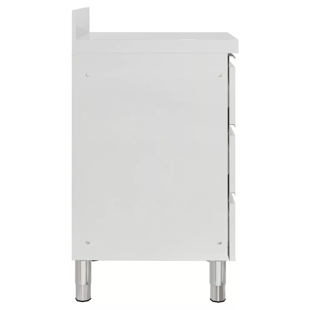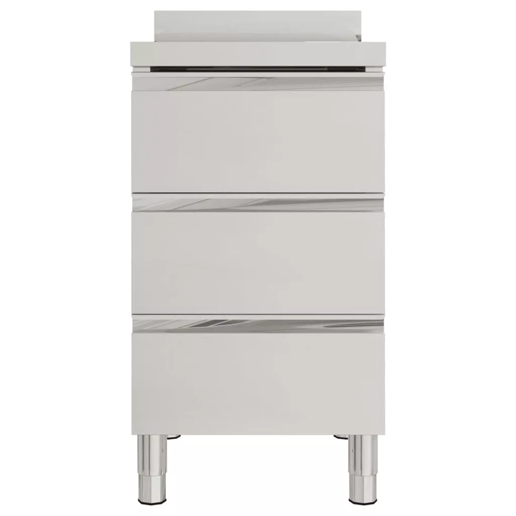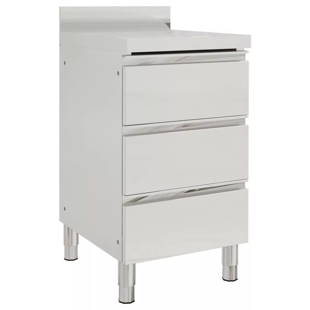 A minőségi, rozsdamentes acélból készült szekrény robusztus, korróziógátló és könnyen tisztítható. A három fiók bőséges helyet biztosít a tisztítóeszközök és kiegészítők tárolására. Az állítható lábak vízszintben tartják a szekrényt egyenetlen padlón. A szekrény egy 10 cm-es vízzáró szegélyt és vízcsőfuratot is tartalmaz.
