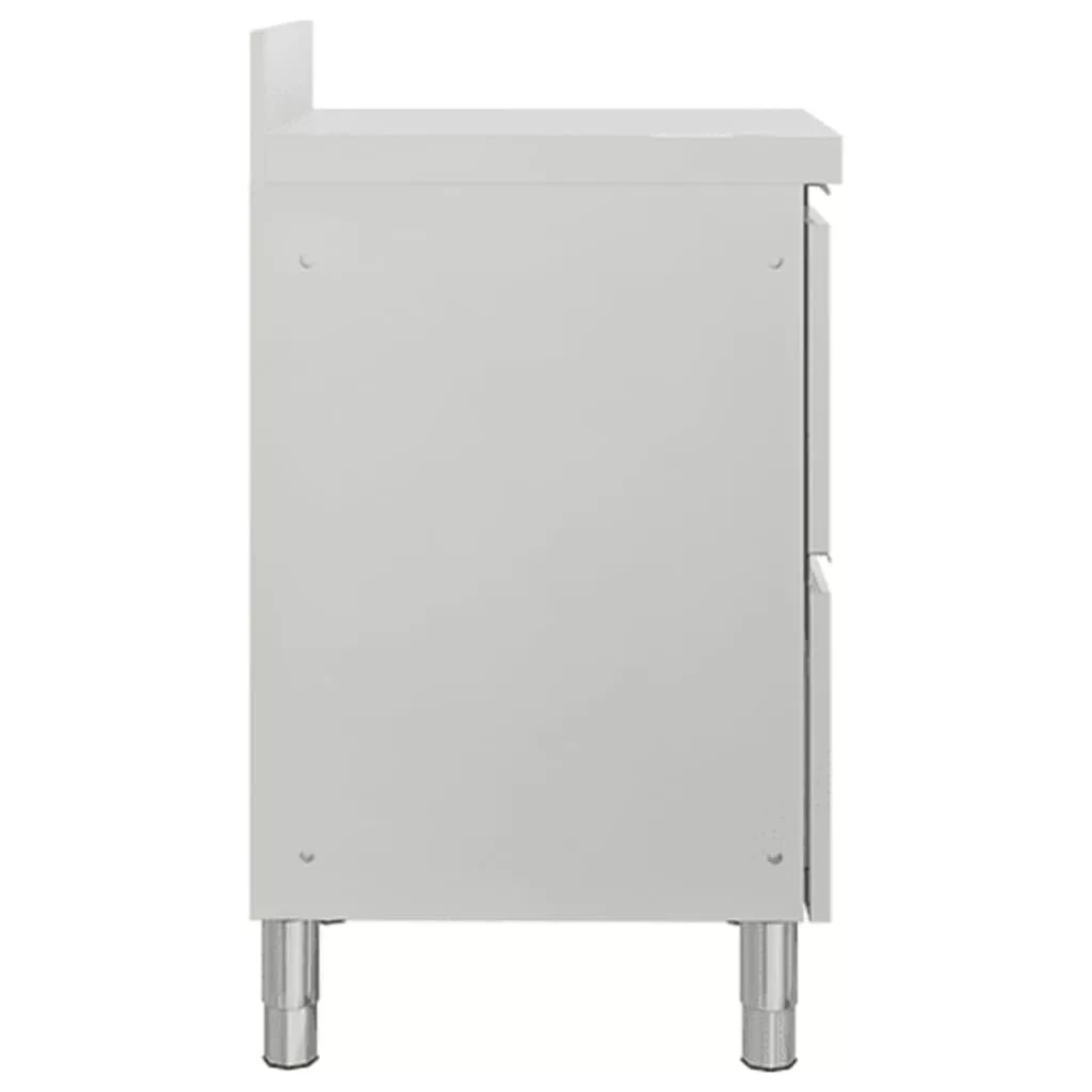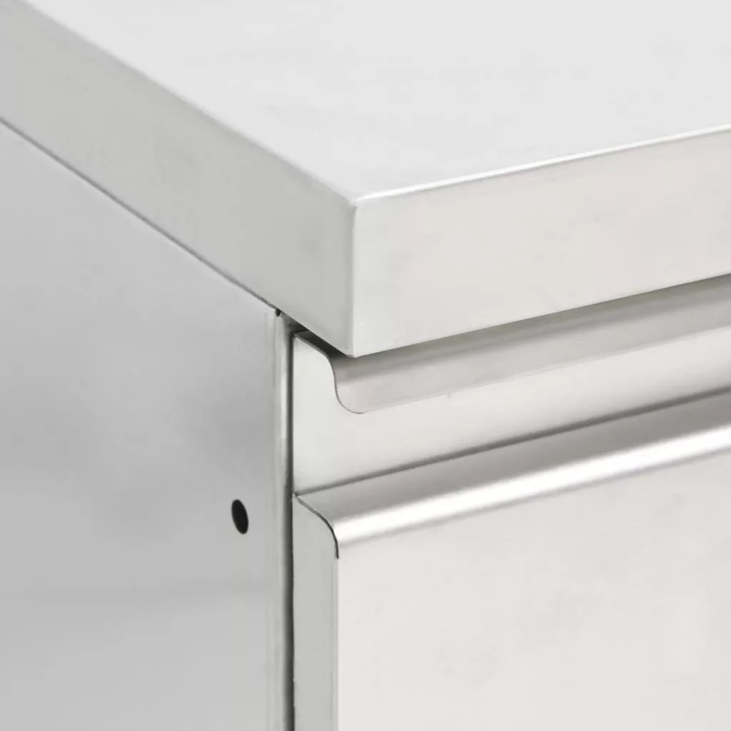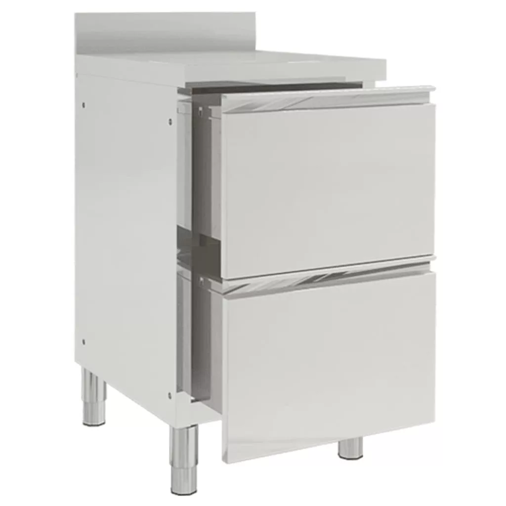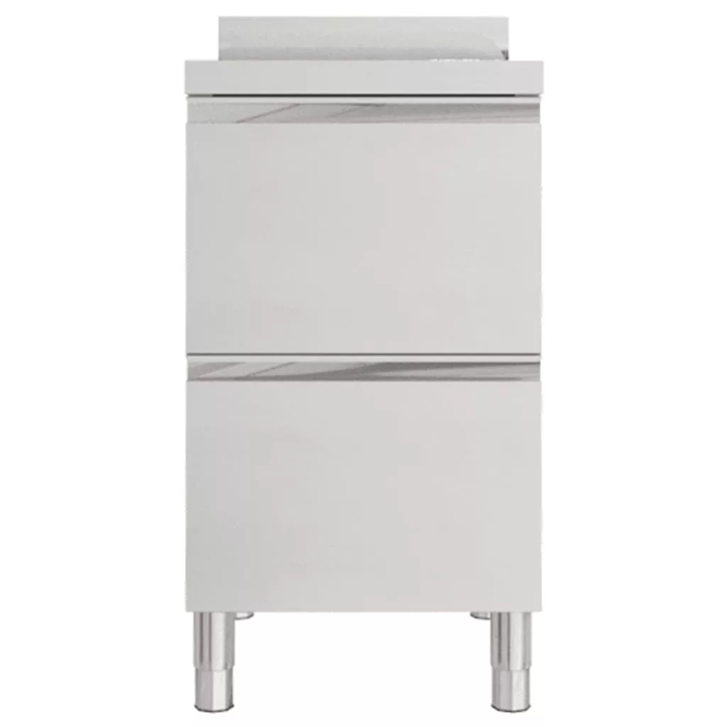 A minőségi, rozsdamentes acélból készült szekrény robusztus, korróziógátló és könnyen tisztítható. A két fiók bőséges helyet biztosít a tisztítóeszközök és kiegészítők tárolására. Az állítható lábak vízszintben tartják a szekrényt egyenetlen padlón. A szekrény egy 10 cm-es vízzáró szegélyt és vízcsőfuratot is tartalmaz.