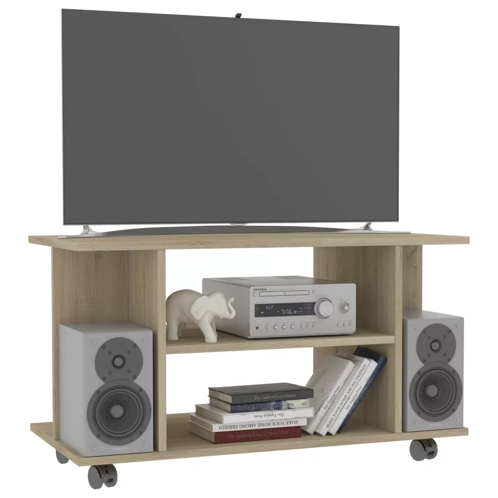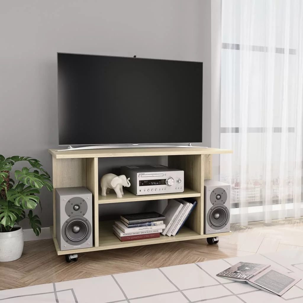 A TV-szekrény szerelt fából készült, amely erőt, tartósságot és hosszú élettartamot biztosít. A 4 nyitott polccal kialakított szekrény bőséges tárhelyet kínál folyóiratok, könyvek, DVD-lejátszók, vevőegységek, lemezek és multimédiás eszközök jól szervezett és elérhető helyen történő tárolására. Ezenkívül könnyen mozgatható a 4 simán gördülő görgővel, és szilárdan a helyén marad a 2 zárható görgővel.