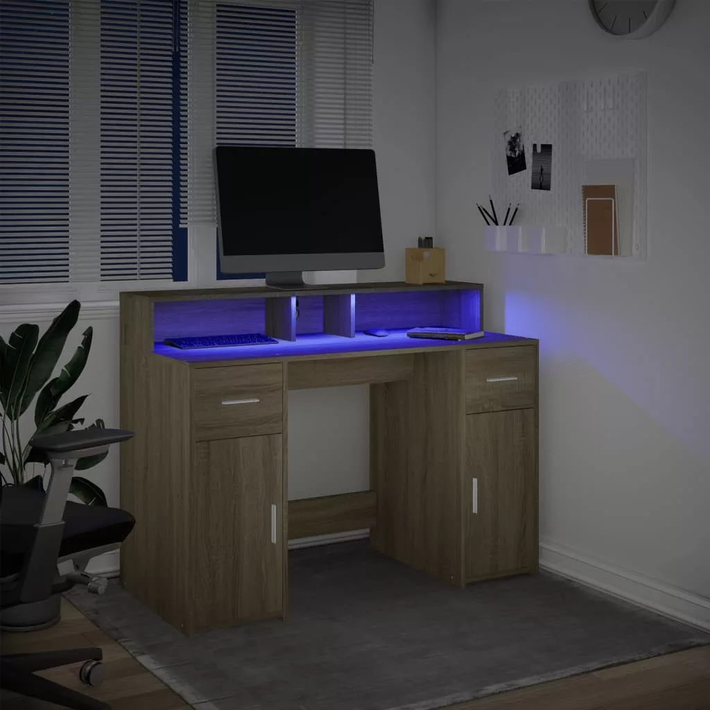Ez a bőséges tárolóhellyel rendelkező, tartós szereketű és LED-világítással ellátott íróasztal tökéletes egy rendezett és elegáns munka- vagy játékkörnyezet kialakításához.