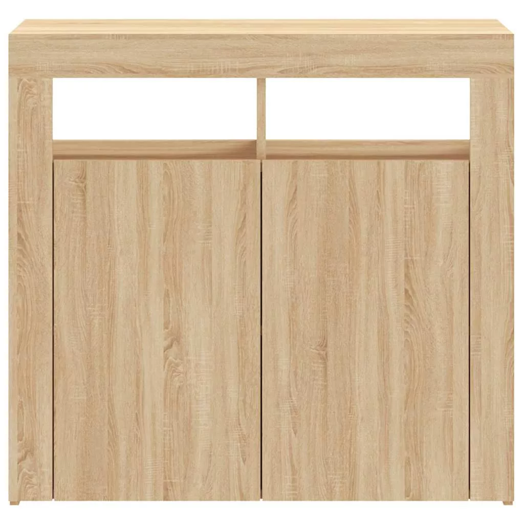 A tálalószekrény masszív felépítésű. így rendkívül strapabíró és masszív. Bőséges tárolóhelyet biztosít könyvek, multimédiás készülékek és egyebek számára. Masszív lapjára dísztárgyakat, képkeretet vagy cserepes növényeket helyezhet. A szekrényben RGB LED-lámpák találhatók, amelyek különböző módon változtatják a színüket, és lehetővé teszik a színek automatikus beállítását. A LED-lámpák kiemelik modern megjelenését, és hozzájárulnak a divatos érzethez.