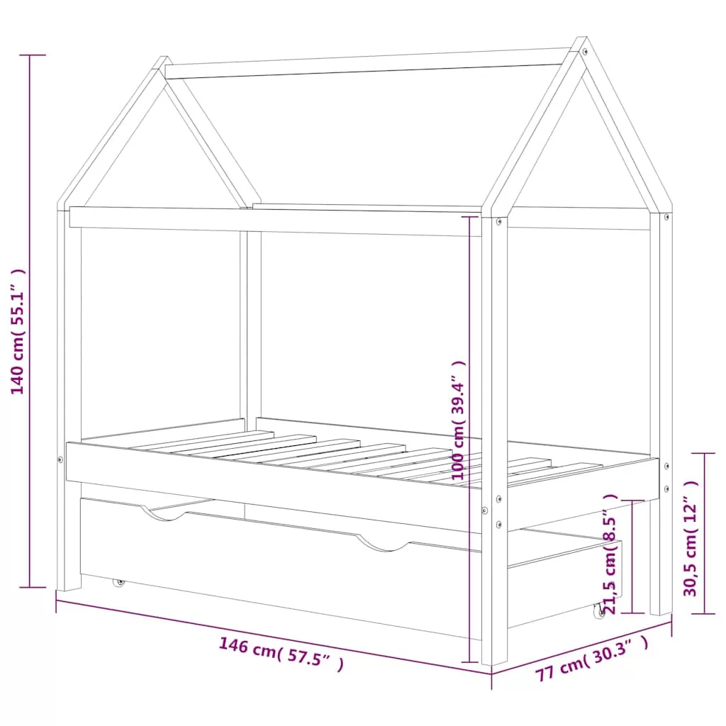 Az ágy okosan megtervezett, faház stílusú kerettel rendelkezik, ahová ágyfüggönyöket akaszthat, hogy magánéletet teremtsen gyermeke számára. Olvasókönyvként vagy játszóházként is használható. Tömör fenyőfából készült, ez az ágykeret rendkívül masszív és tartós. Az erős lécek biztosítják a szükséges tartást és nagyon kényelmesek. A mellékelt, 2 fogantyúval ellátott ágyfiók bőséges tárolóhelyet biztosít összehajtott ruhák, játékok stb. tárolására, így a szoba tiszta és rendezett marad. A könnyen gördülő kerekek szőnyegpadlón és fa padlón is használhatók. Ez az ágykeret 70 x 140 cm-es matrachoz alkalmas.