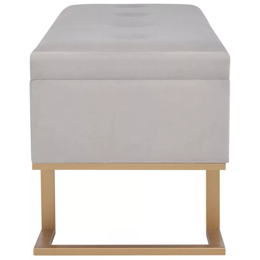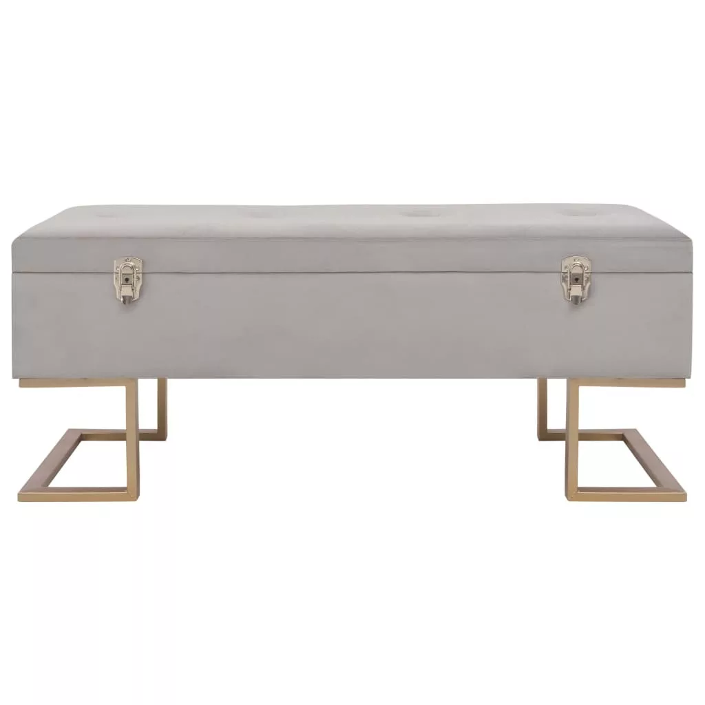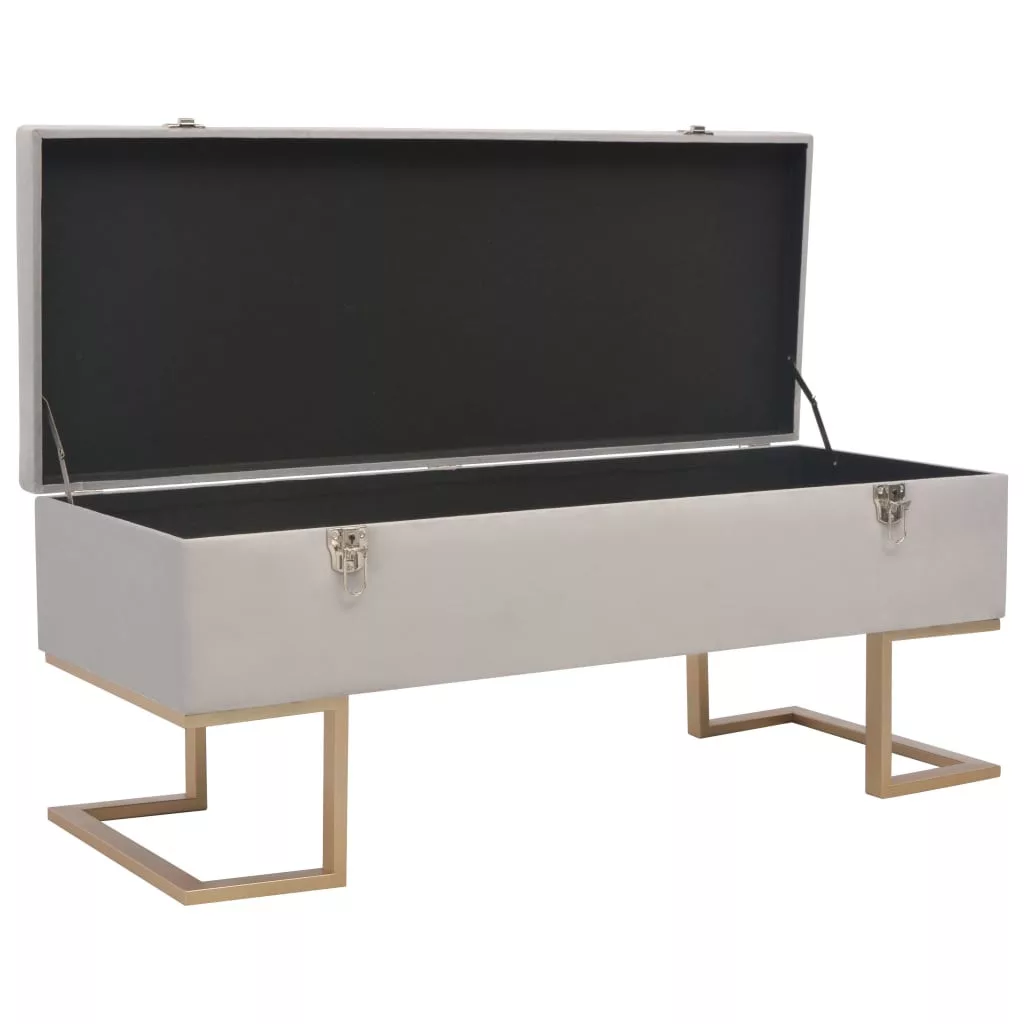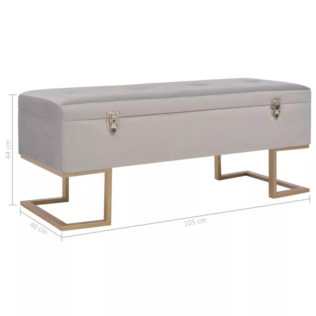 Ez a szürke bársonykárpitos pad puha tapintású és rendkívül hangulatos, miközben élettel tölti meg belső terét. Belső tárolórekesszel rendelkezik, ami extra helyet kínál különböző tárgyak tárolására. Emellett, az aranyszínűre festett, porszórt bevonatú vaslábaknak köszönhetően ez az előtéri pad rendkívül stabil és tartós. Padunk elbűvölő kiegészítője lesz otthonának.
