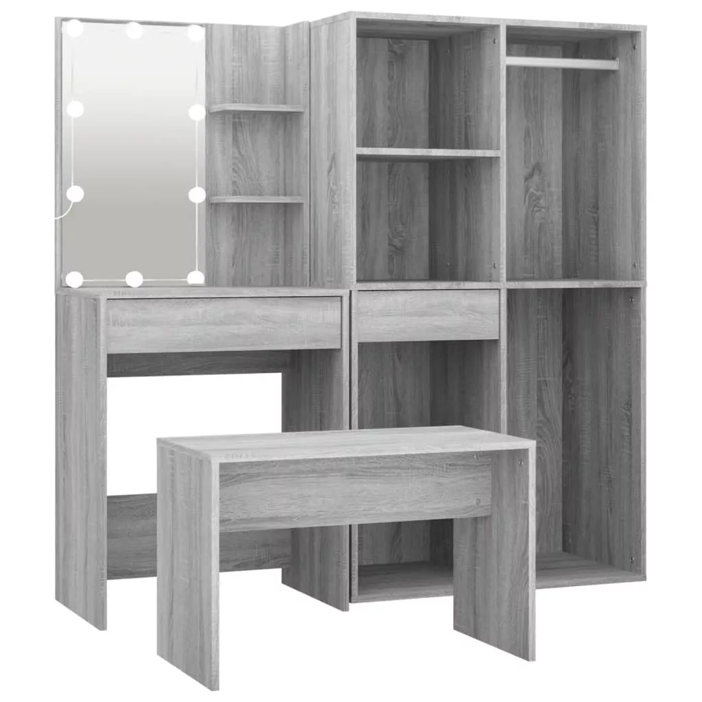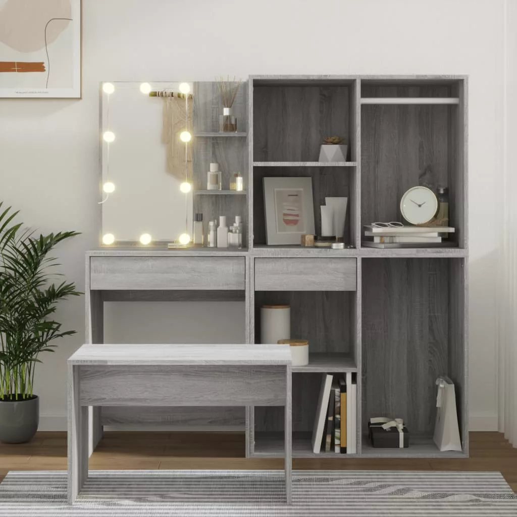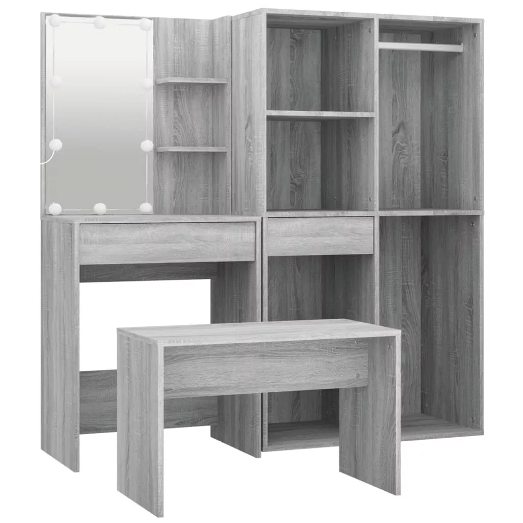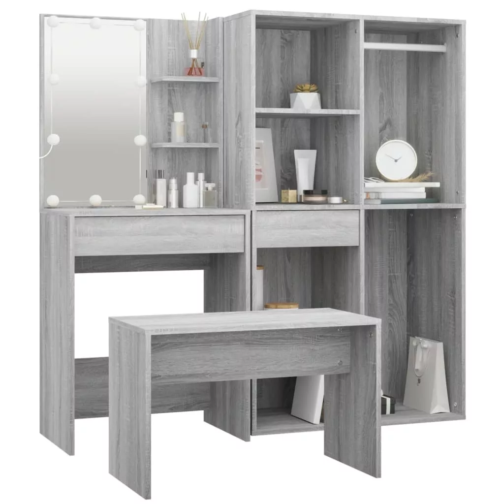 vidaXL szürke sonoma színű szerelt fa fésülködőasztal-szett LED-ekkel