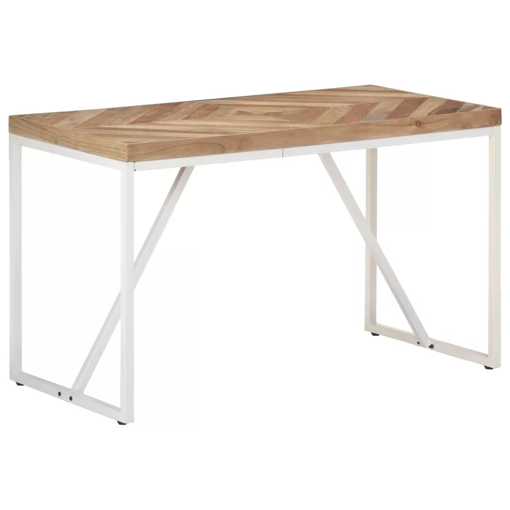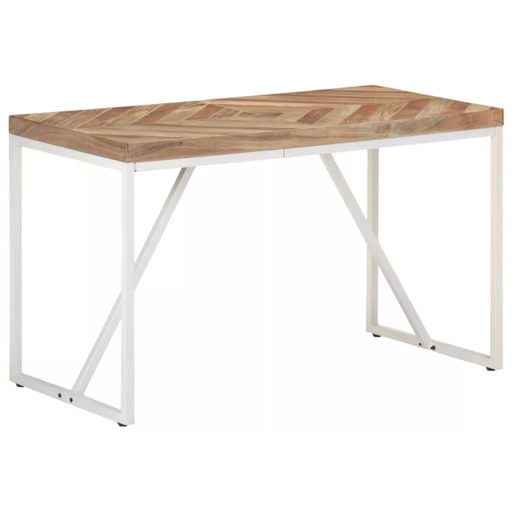 Ez az akácból és mangófából kézzel készített étkezőasztal rendkívül stabil és strapabíró. A fehér porszórt bevonatú acéllábak extra stabilitást biztosítanak. A masszív asztallap ék alakú, mozaikos dizájnt kapott, különleges díszítőelemmé téve az asztalt enteriőrjében. Italokat és harapnivalót is helyezhet rá.